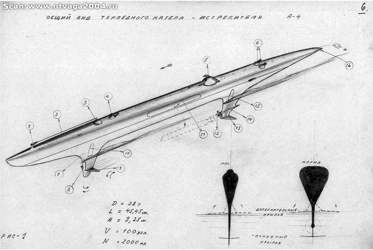В СССР в 30-х годах за передовыми идеями следили очень внимательно. В ЦАГИ изучали гидродинамику подводных крыльев. Был построен опытный катер конструкции В.Г. Фролова и А.Н. Владимирова, а также опытный катер Л.А. Эпштейна. В 1936 году Н.Е. Кочиным, М.В. Келдышем и М.А. Лаврентевым были получены формулы для определения гидродинамических сил, действующих на тонкое крыло, движущееся под свободной поверхностью жидкости. Это была серьёзная системная работа, но огня особого не наблюдалось. Нужен был энтузиаст. И он появился. Им стал выпускник кораблестроительного факультета Горьковского индустриального института Ростислав Евгеньевич Алексеев. Трудно сказать, когда Алексеев заинтересовался катерами на подводных крыльях. Ещё труднее понять, почему он решил пойти своим путём в изучении этой проблемы. Но зато известно, что в качестве дипломного проекта, который он защитил в 1941 году, он разработал именно торпедный катер на подводных крыльях. Руководство института заявляло, что дипломный проект «имеет уровень научно-исследовательской работы, а в отдельных разделах приближается к уровню кандидатской диссертации». То, что сделал Алексеев вообще не напоминало то, что делали в Европе. Вот его рисунки этого катера: