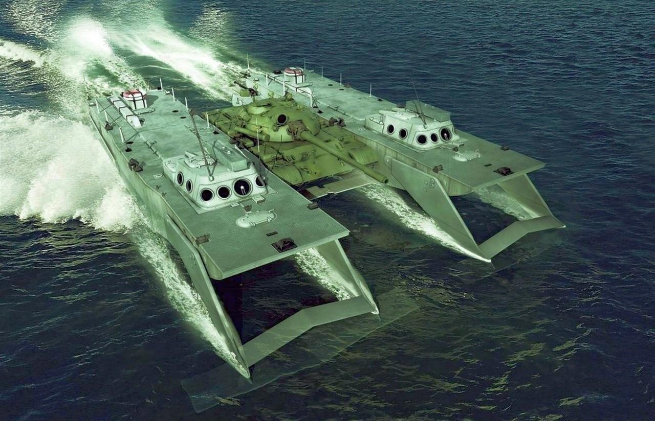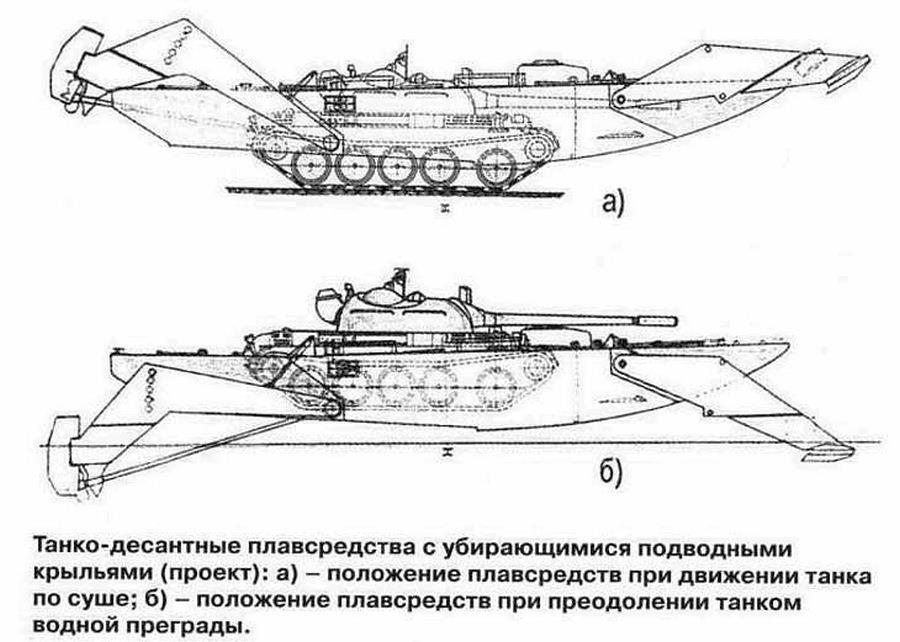 Так было, например, с проектом танконесущей быстроходной десантной баржи на подводных крыльях. Идея казалась заманчивой. Два быстроходных понтона со складными крыльевыми устройствами, размеры которых соответствовали транспортному габариту, крепятся с двух сторон к танку: