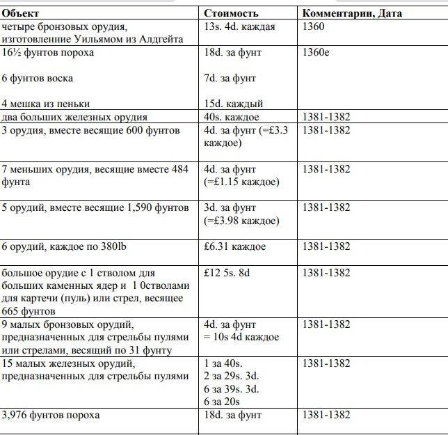 Большое осадное орудие весом 665 фунтов стоит 12 фунтов. По образцу 1369 года - это 5 полных доспехов типа "бацинет + кольчуга +бармица +латные перчатки". Также за эти деньги можно было неделю оплачивать службу 120 валлийских пехотинцев.