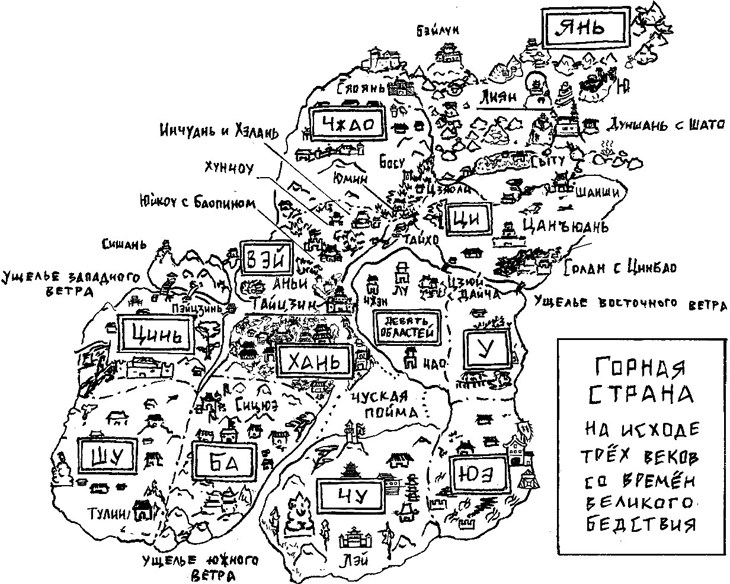 Горная страна похожа на старинный имперский Китай. Да-да, тот самый, с полотен «горы и потоки». И если с потоками всё не так просто, то горы здесь повсюду. Горы, у подножия которых всё так же клубится ядовитый туман. Горы, соединённые мостками, подчас предательски ненадёжными. Горы, увенчанные городами и крепостями, заставами и крестьянскими усадьбами, павильонами для художников и одинокими хибарами. Горы, вокруг которых кружат гуйшэни — крылатые хищники, появившиеся вместе с туманом, гроза зазевавшихся путников. И где-то там, от вершины к вершине, от тайны к тайне, проходит путь нашего героя, провинциального чиновника, получившего в наследство ответы на загадки, которые ещё только предстоит сформулировать…