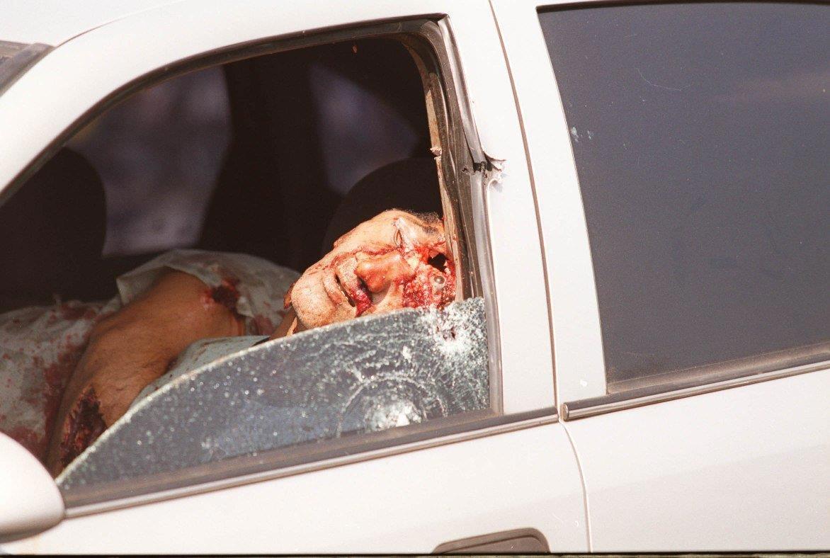 Здесь правильное попадание - пулевое в голову. Автомат Калашникова с близкой дистанции.