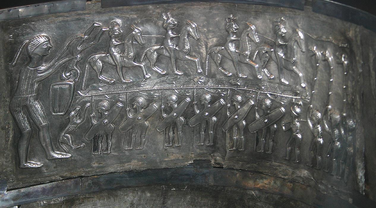 Опять сцена с Гундеструпского котла, предположительно изображающая эпизод той самой войны. Человека на ней не варят (как можно было бы предположить), а воскрешают: Бран владел чудесным котлом, подаренным ему загадочным великаном из Ирландии, и если в этот котел опускали тело убитого сегодня, то на завтра он был снова жив.