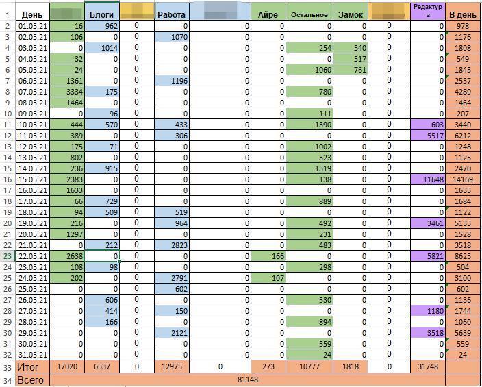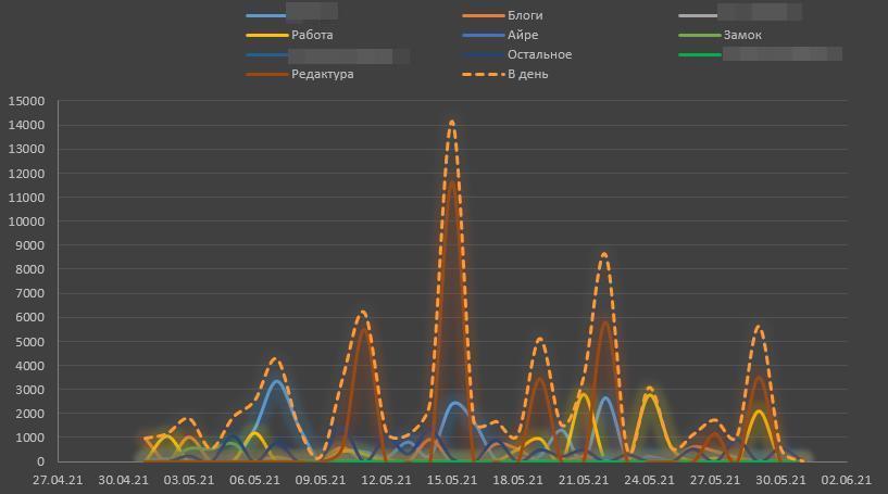 Довольно неровно выглядит работа, есть много провалов, хотя в общем цифры держатся на прежнем уровне. Вы видите провал в низу первой колонки и общее иссякание запала в 20-х числах — так повлиял реал, было много других дел.