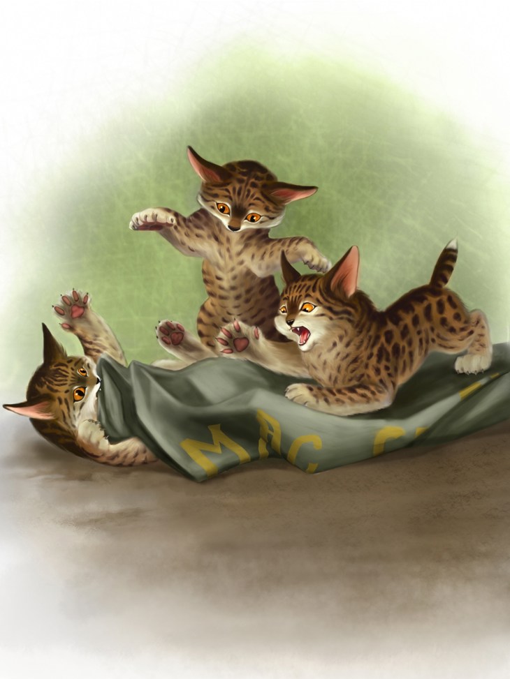 Это, правда, не взрослые рлаши, а дети возрастом около восьми земных (пяти аккийских) лет. Эти дети размером примерно со взрослую рысь, взрослые - с бенгальского тигра (скорее, бенгальскую тигрицу). Да, у них лапки. По рисунку не очень понятно, но у них нет усов и подусных подушечек.