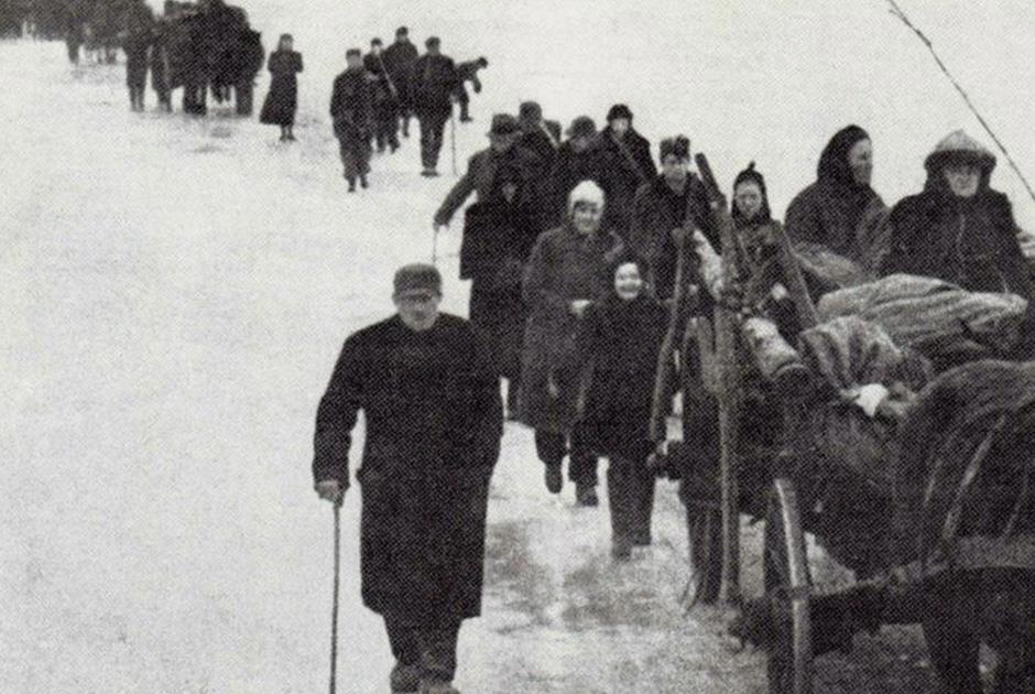 Беженцы и беженки уходят из Восточной Пруссии по льду.