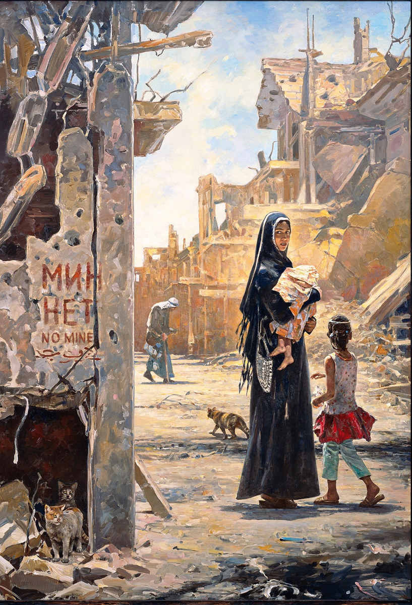 Маленькая деревня на переднем крае. Дома на западной окраине разбиты ещё во время ожесточённых боёв три года назад. В остальном селение целое и жизнь в нём продолжается как и раньше - работает школа, сады и поля выпалываются и исправно поливаются, скотина пасётся под присмотром худеньких черноглазых пастушков.