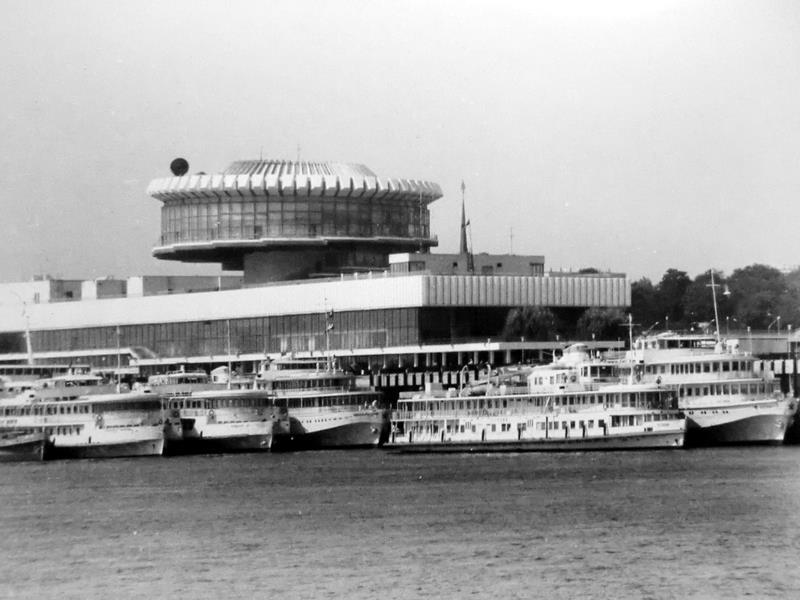 Сказано одновременно и много, и мало. Строительство этого уникального здания, размером с московскую Красную площадь, началось в 1967 году. В 1978-м стройке помешала Детская Железная Дорога, которую "временно" (до сих пор) перенесли с Набережной в пойму Царицы - об этом было здесь https://author.today/post/151333 , в 1980-м была открыта первая очередь речвокзала, и он начал принимать пассажиров, но строительство продолжалось вплоть до 1992-го! Великолепное здание в духе позднего СССР - существует даже легенда, что ресторан-"шайба" могла когда-то вращаться, но людей видевших это своими глазами я не знаю, поэтому лучше помолчу - пусть за себя говорят фотографии разных лет: