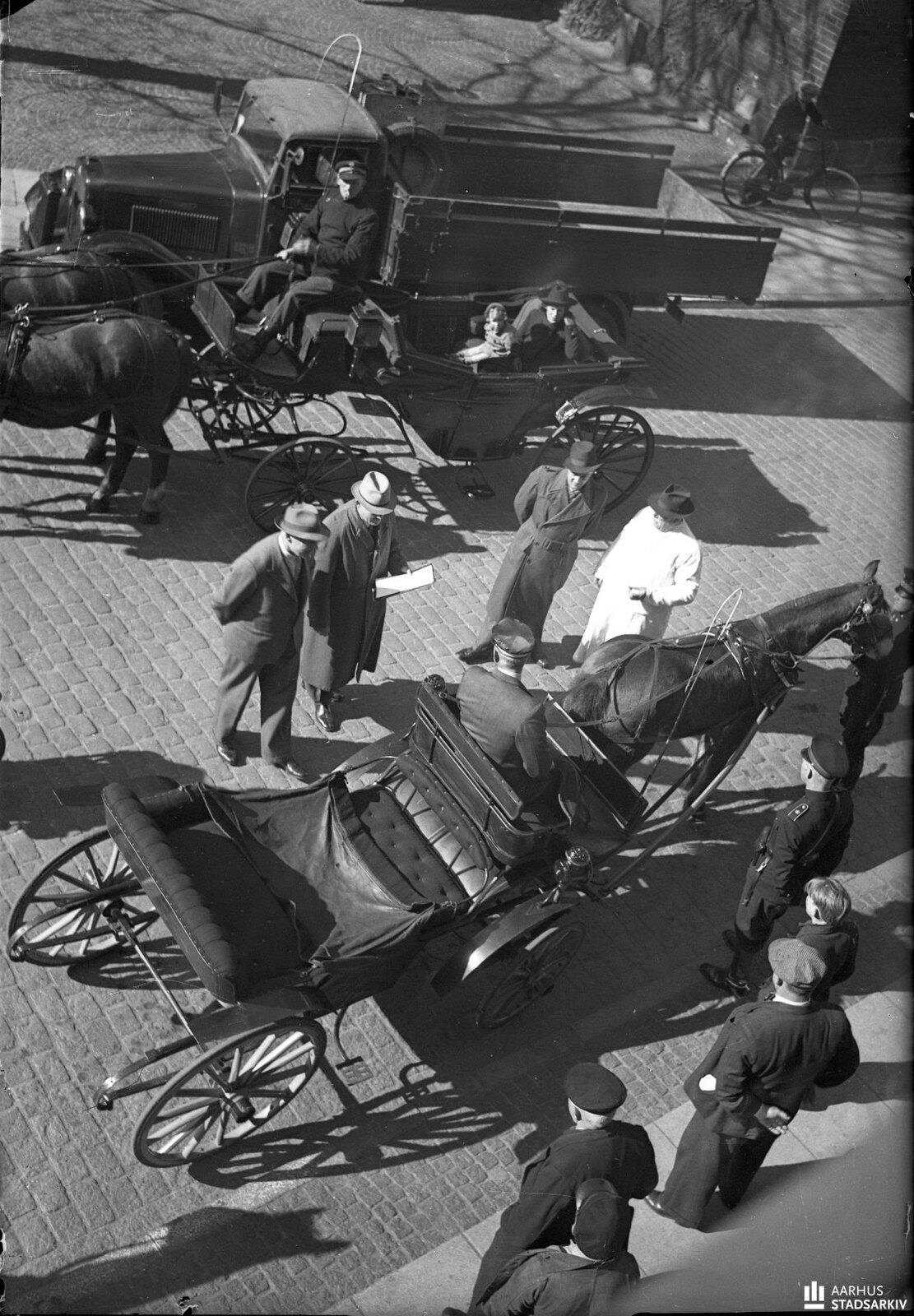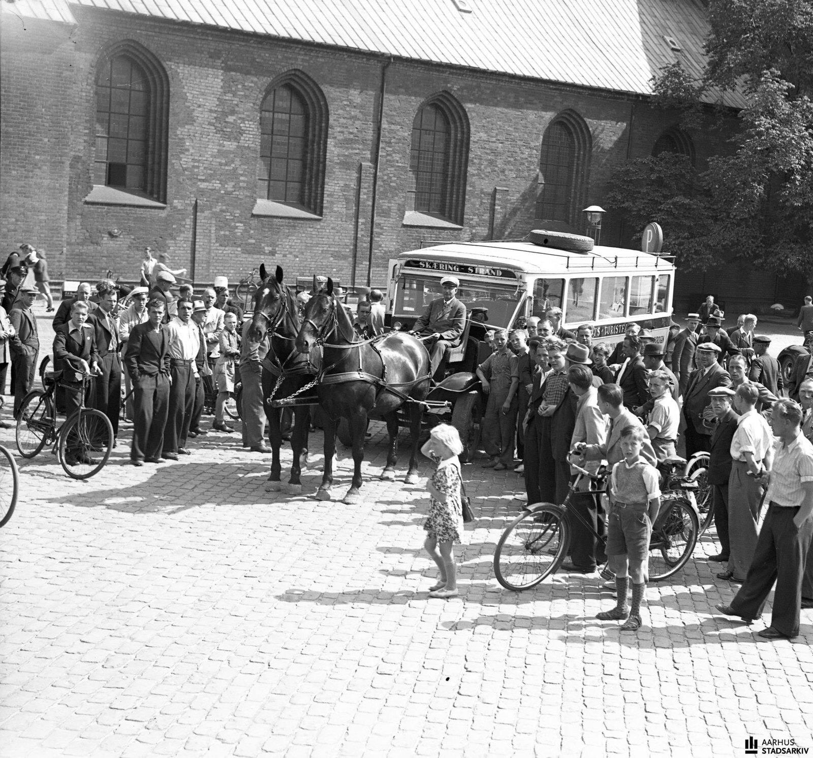 1940. Толпа вокруг автобуса с двумя запряженными лошадьми.  Переоборудованный автобус, который использовался для движения по  маршруту Орхус-Скуринг, принадлежит ресторатору Ингеману Шмидту