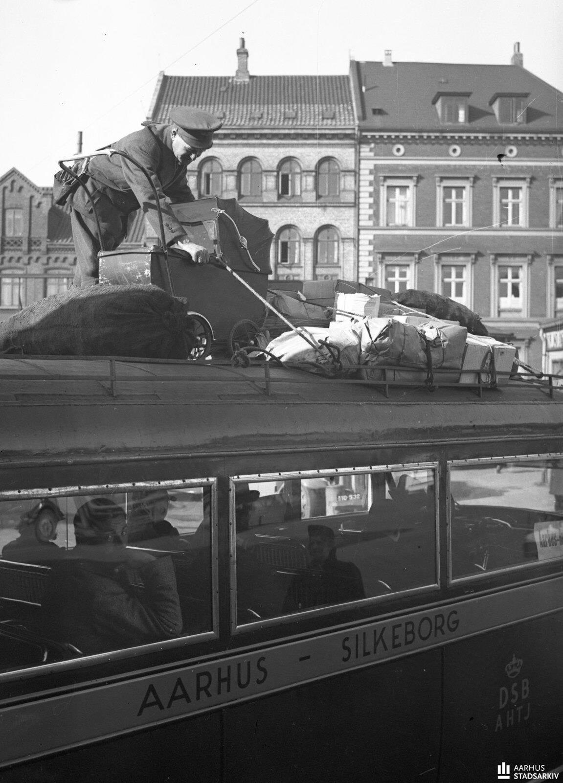 1943. Водитель Альфред Кристенсен загружает багаж на крышу автобуса