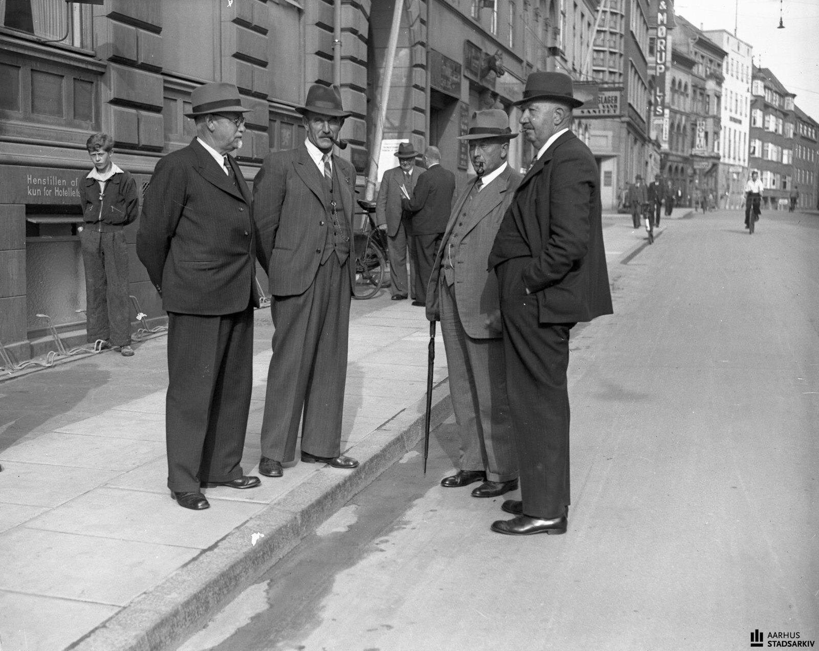 1940. Встреча представителей Молочной ассоциации в Орхусе. Слева направо  - председатель датской ассоциации молочников А. Йоргенсен, промышленник  Я. Энгберг, профессор Н. Кьоргаард-Йенсен и владелец фермы А. Андерсен.  Встреча в молочном объединении, где ок. 100 представителей со всей  страны собрались, чтобы обсудить значение войны и оккупации для датской  молочной промышленности с упором на торговлю с Англией и Германией.
