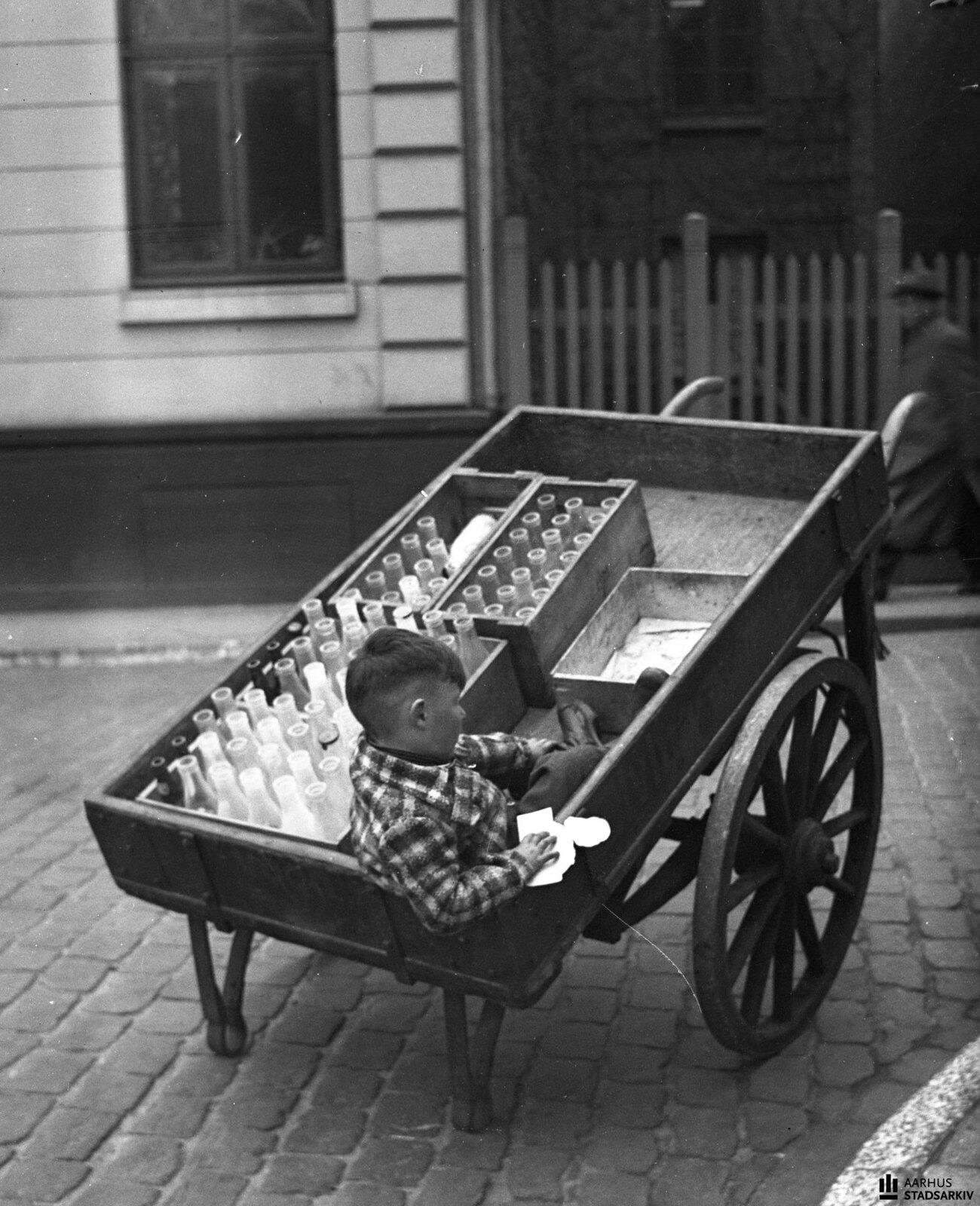 1943. Мальчик сидит в тележке с молочными бутылками