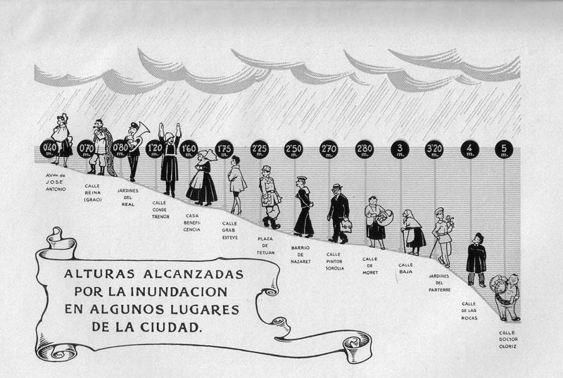 Первый пик паводка пришёлся на 4 утра 14 октября, когда по реке проходило 2700 кубометров воды в секунду. Были затоплены многие районы Валенсии, отключилось электроснабжение, телефонная связь и прекратилась подача питьевой воды. После этого уровень воды начал падать. Казалось, что можно приступать к наведению порядка, расчистке улиц от огромного количества грязи, нанесённой рекой. Но в 13 часов началась вторая волна наводнения, более сильная. На пике в 15 часов через Турию в окрестностях Валенсии проходило 3700 кубометров воды в секунду. Есть любопытная диаграмма, показывающая, как сильно затопило некоторые районы Валенсии.