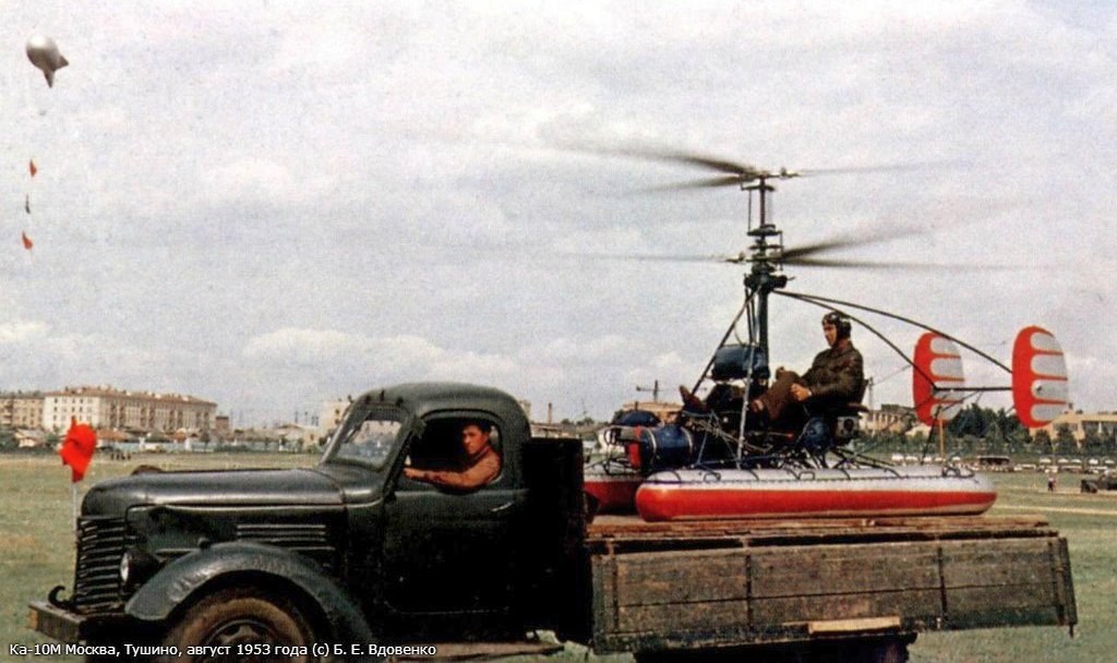 Вертолёт обладал завидной управляемостью. Вот здесь демонстрировалось прямо на празднике, как пилот сажает Ка-10М в кузов движущегося грузовика: