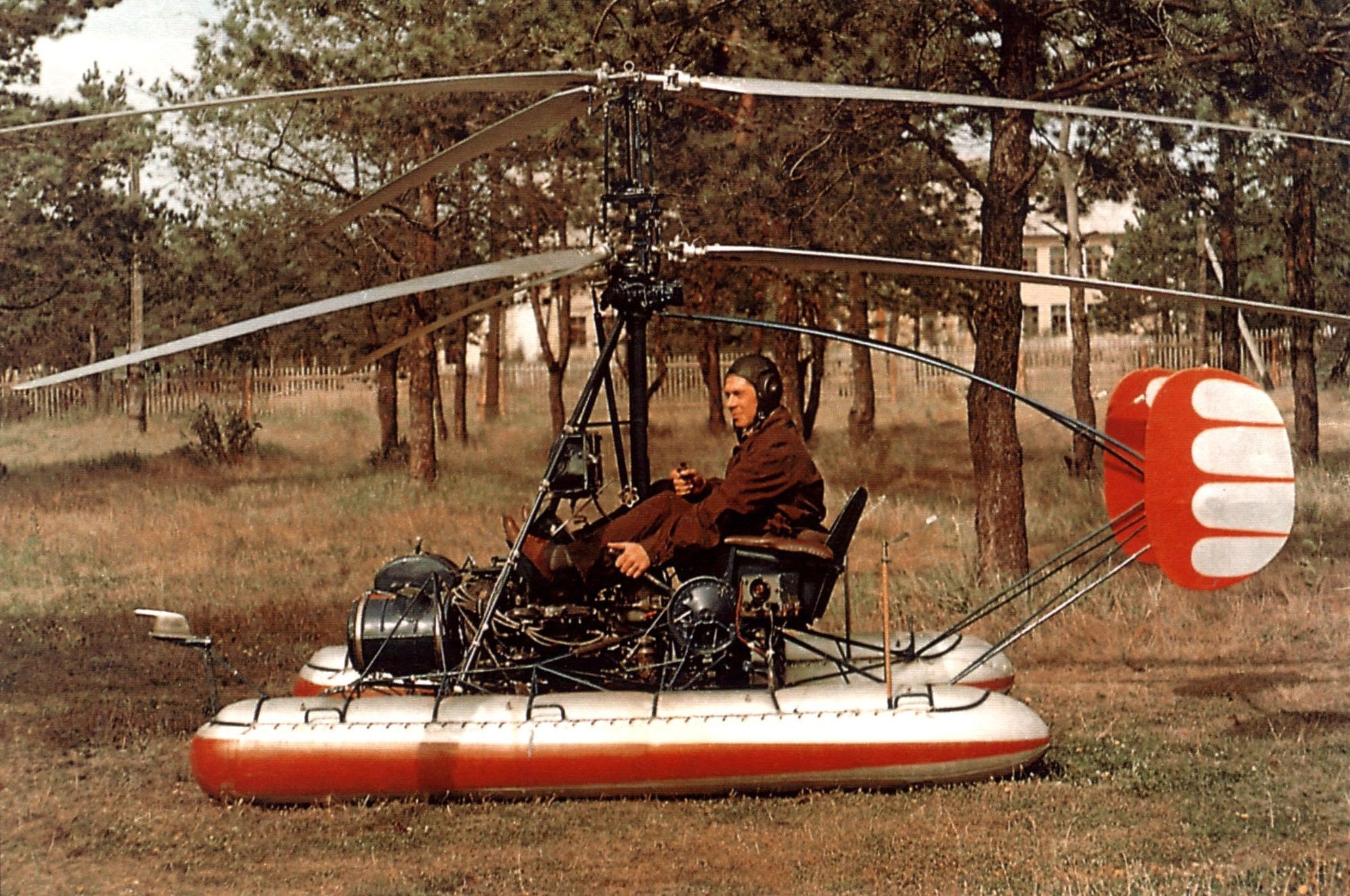 Ну а что же сами "настоящие" вертолёты? Да то же самое только «ещё хуже». В том смысле, что минивертолётов понаделали куда больше, чем автожиров. У нас в стране одним из первых, кто начал заниматься вертолётами – КБ Яковлева. Среди тем, которые там прорабатывались была и очень сложная но перспективная тема вертолётов соосной схемы. Потом результаты этой работы были переданы в КБ Камова, который сумел всё начатое довести до ума и построить сначала Ка-8, а потом и Ка-10. Замечательные для своего времени были машины. Обе они относились именно к ультралёгким машинам. Вот он – одноместный Ка-10 с надувными баллонами, позволявшими ему садиться не только на землю, но и на воду: