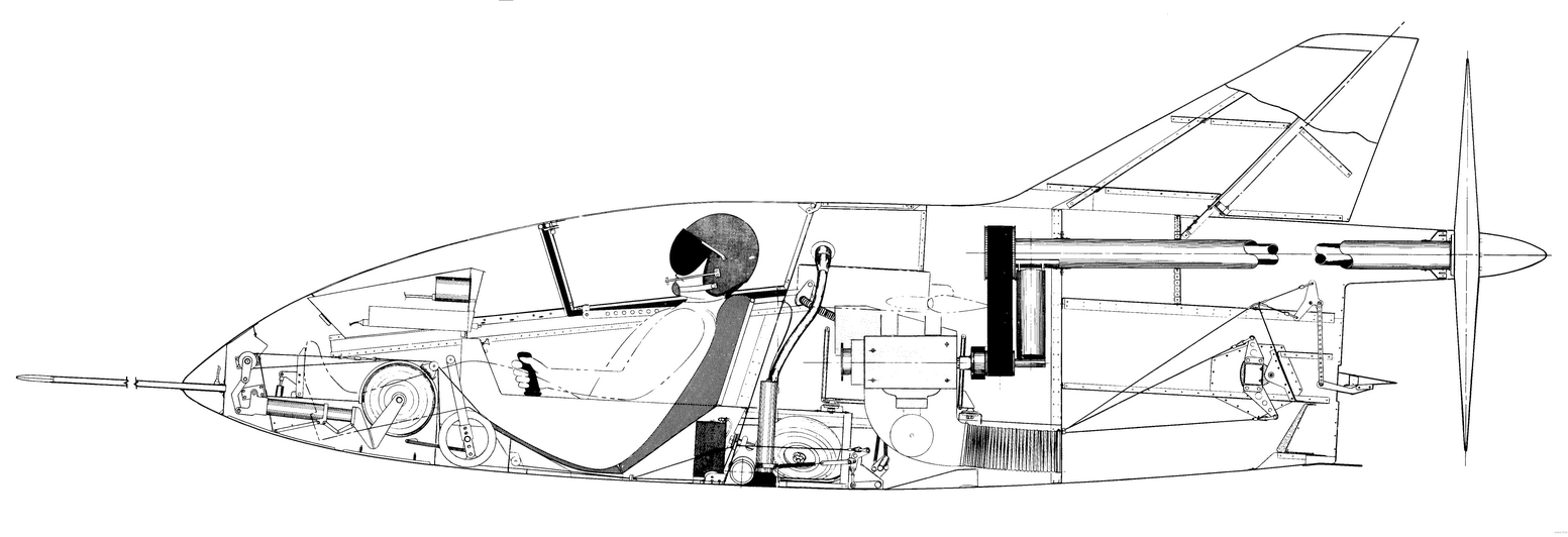 Джеймс Беде о рекордах не думал, когда создавал свой минисамолёт. Он мыслил очень практично и учёл несколько особенностей родного американского законодательства и психологию потребителя. То есть, с одной стороны, люди – натуры увлекающиеся и для многих из них «гордость творца» совсем не пустой звук. С другой – в США самолёт-конструктор не подлежит обычной сертификации. Там любитель может построить самолёт из набора деталей, провести самостоятельно его испытания и получить разрешение на полёты, как на экспериментальной машине. Если ошибся – ты, как свободный человек, имеешь полное право свернуть себе шею. Ну и стоимость комплекта деталей стоит много меньше готового изделия – тоже серьёзный фактор. Но и этого мало. Джеймс был уже опытным конструктором и сумел очень умело скомпоновать свой самолёт, добиться отличной аэродинамики и сразу предложил его в трёх вариантах. Самый быстрый оснащался турбореактивным двигателем, на двух других ставились ДВС с тремя разными мощностями. Они отличались длиной крыла. Один поэкономичнее, но тихоходный, другой побыстрее, но менее экономичный. Машина вся состояла из оригинальных решений. Например, у самолёта было убирающееся вручную шасси, ручка управления стояла сбоку, а для привода от ДВС на винт была использована клиноременная передача! Вот так и появился БД-5 «Микро». Вот схема поршневого варианта: