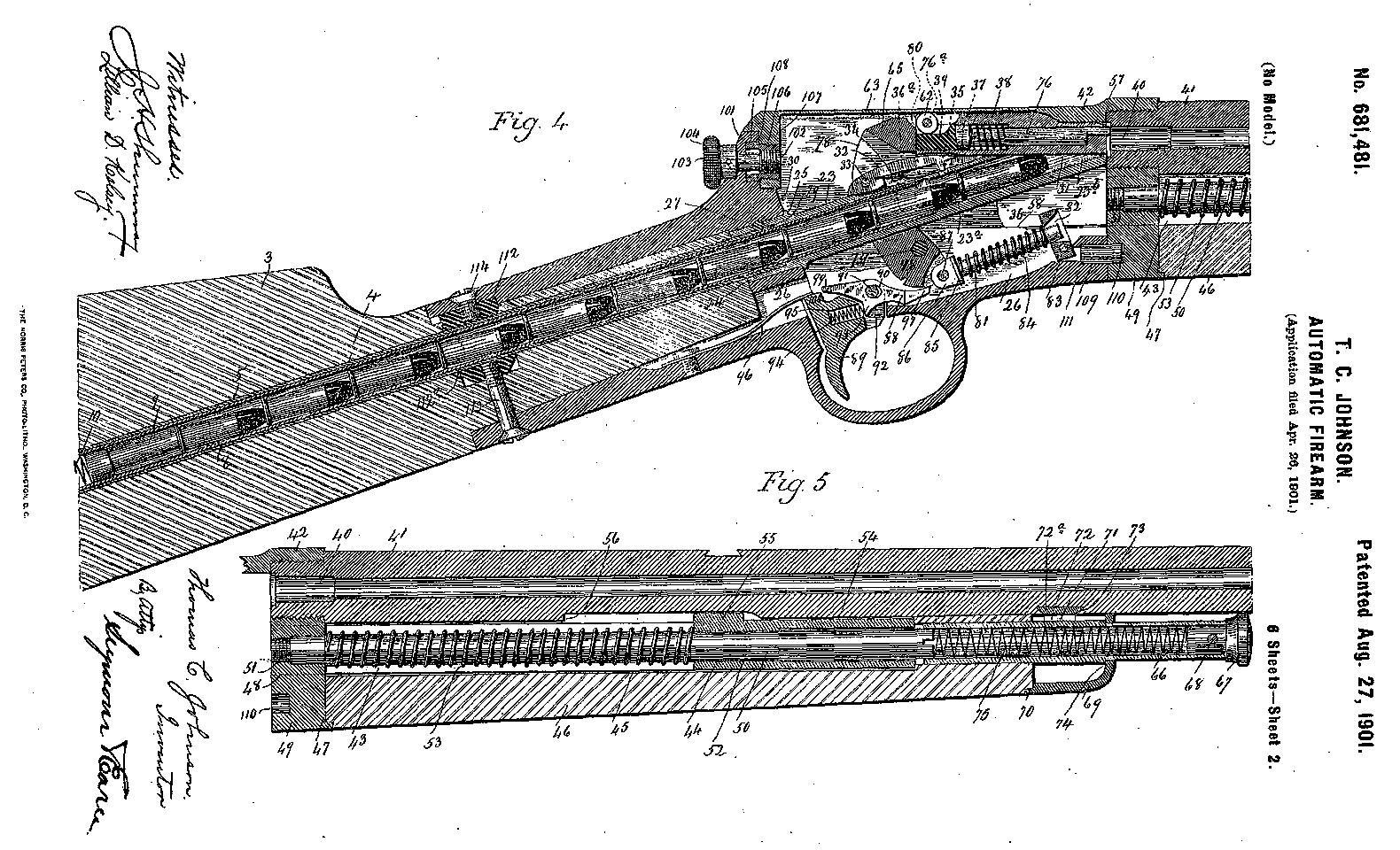 Началось всё с того, что на работу в фирму Winchester Repeating Arms Company устроился конструктор Томас Кроссли Джонсон, который трудился над автоматизацией всяких стрелялок. Он и разработал патрон кольцевого воспламенения калибра .22 Winchester Automatic (5,6 мм) и автоматическую винтовку под неё. Автоматика винтовки работала за счёт отдачи. Вот картинка из патента: