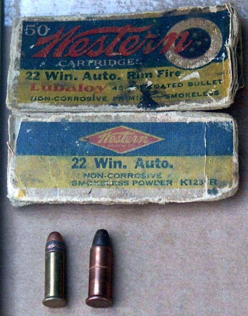 Нужно заметить, что примерно в это же время чёрный порох, дававший много нагара и прочих неприятностей, стали заменять на бездымный порох. Вот в этой борьбе и родился патрон .22 Winchester Automatic. Его сделали немного отличным от старых аналогов, чтобы они не могли использовать старые патроны с чёрным порохом в автоматической винтовке. Вот он, если интересно, а рядом коробки, в которых его продавали охотникам. Ведь карабин предназначен был именно для них: