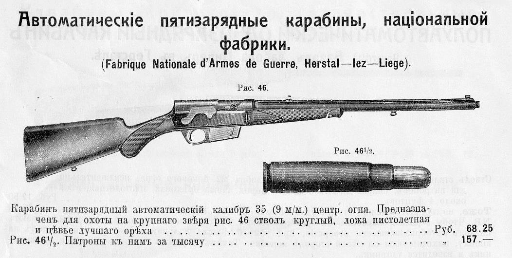 Это мощный автоматический карабин для охоты уже на крупную дичь производства Бельгии («Fabrique Nationale d'Armes de Querre» более известная, как FN). То есть это уже почти боевое оружие. Вскоре появились и другие последователи автоматизации оружия. То есть идея пошла в массы. До появления могучих боевых АВС-36 или СВТ оставалось совсем немного времени... а ведь начиналось всё просто с охоты на мелкую дичь...