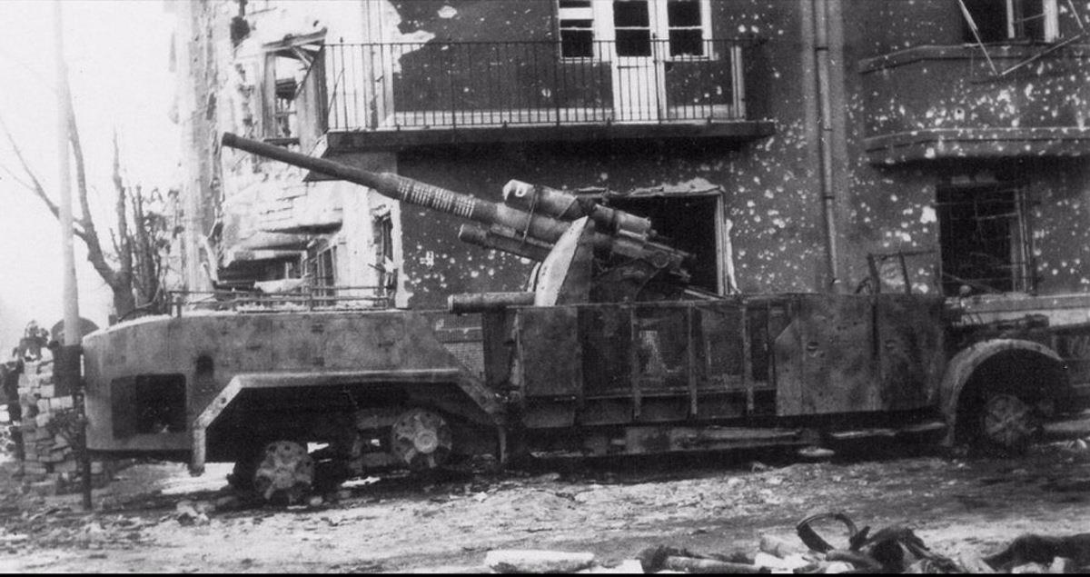 И судя по абшус-балкам на орудии - до своего закономерного финиша это чудо инженерной милитаристской вивисекции поразило 18 целей. Будапешт. 1945 год.