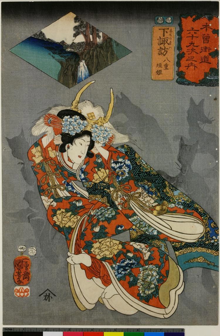 И вдруг шлем в ее руках засверкал божественным светом, и Яэгаки-химе ощутила невиданную силу и словно бы воспарила в небо. Оттуда, с высоты полета птиц, она узрела путь через ледяное озеро, поспешила туда и нагнала любимого. Ее сопровождали две огромные белые лисицы, которые не подпустили к влюбленным вооруженных до зубов ниндзя.