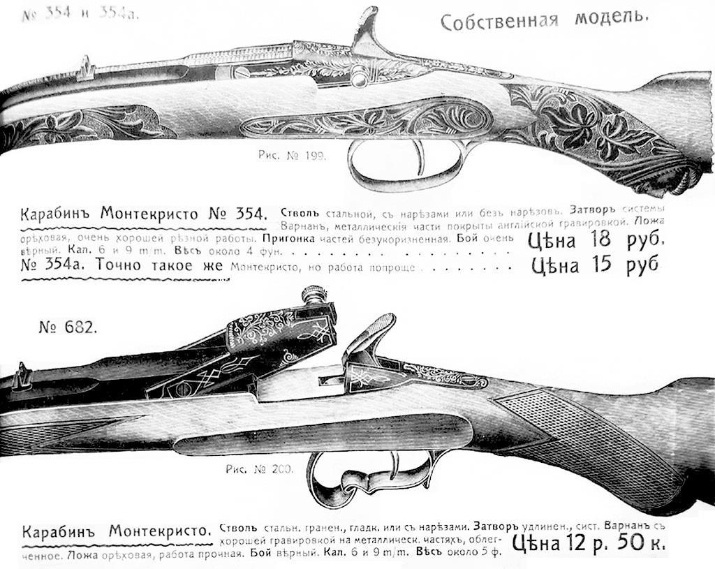 В каталогах среди винтовок «монтекристо» разнообразия немного больше. Вот это два образца такого оружия «тяжёлого» типа. То есть они явно не салонные. Зато с такими можно сходить на охоту. Выглядят они, соответственно, как вполне рабочие винтовки, хотя и продаются без разрешения от властей:
