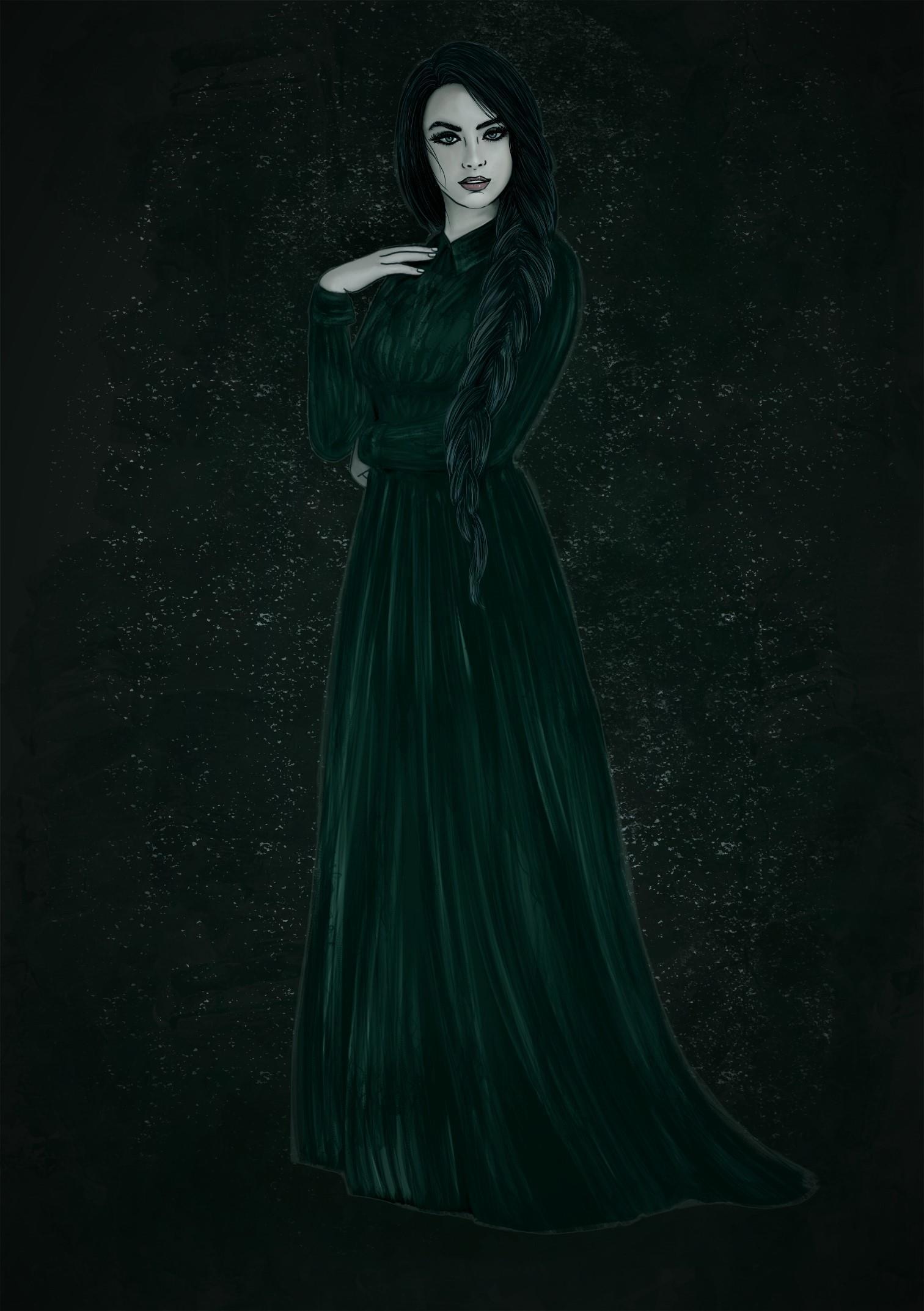 Белоснежная кожа и чистые черты лица. Чёрные брови как след от кисти мастера. Глаза – космические омуты в идеальном обрамлении ониксовых стрел ресниц. Смотрит на меня, как на старого знакомого, и улыбается, задорно сверкая совершенными зубками. А губы строгие, очень строгие, несмотря на улыбку. Чёрная коса, толщиной с моё запястье, переброшена через плечо и спускается ниже талии. Королевская осанка. Идеальная фигурка под закрытым и длинным, до пола, платье. Нежная длинная шея и округлые плечи под шелковистой тёмно-зелёной тканью. Изящные, точёные кисти рук. Грудь… просто божественная. Нырнуть и забыть обо всём….