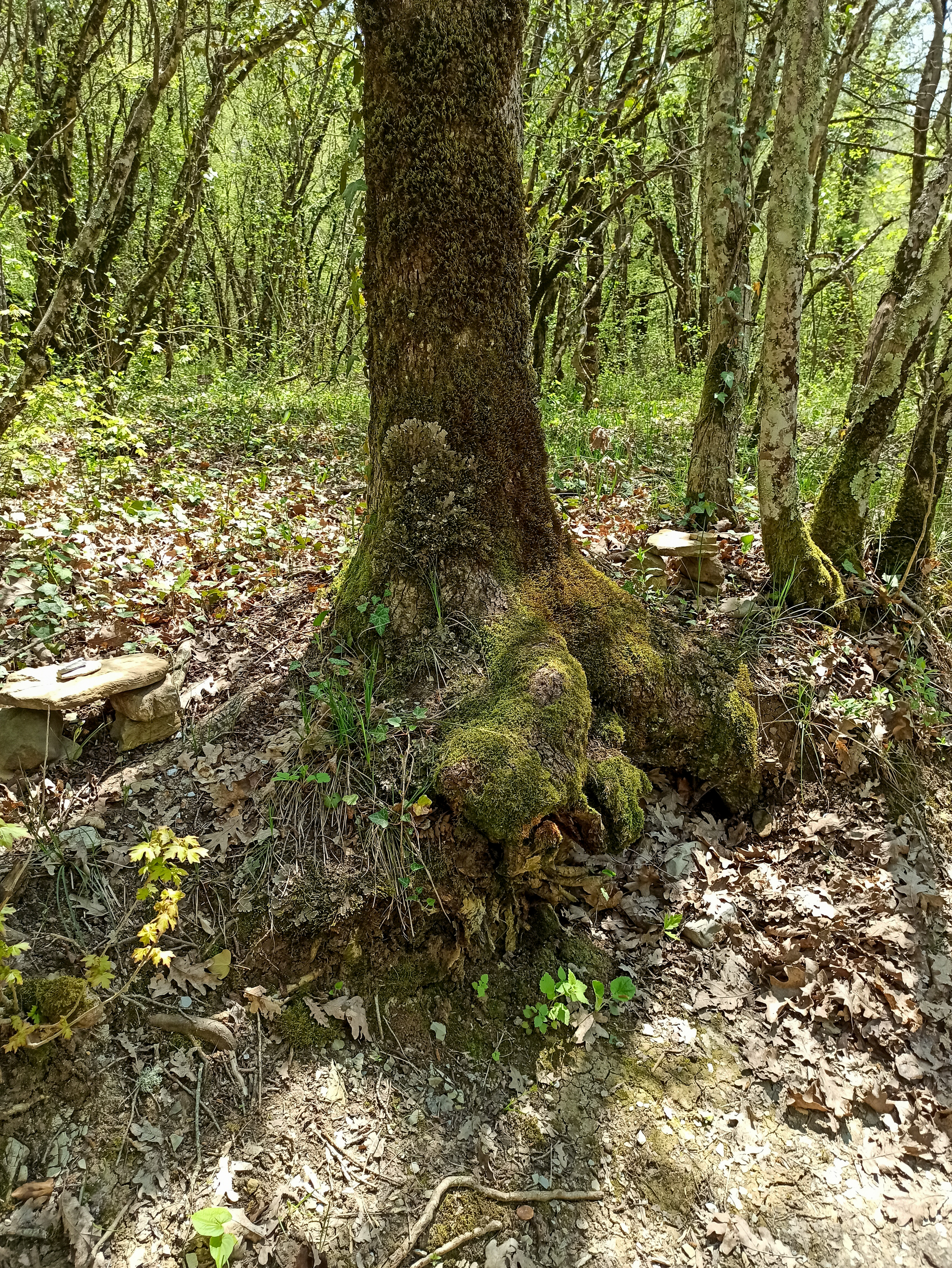 Самый труднодоступный дольмен - это четвертый, его назвали "Нежность". Стоит он в абсолютно неромантичном месте, на границе леса и поля. Атмосферу портит плакат на заборе и ЛЭП. И к нему ведет крутой спуск, своеобразная лестница из корней. При слабой физической подготовке будет трудновато спуститься и подняться. Фото с нижней точки: