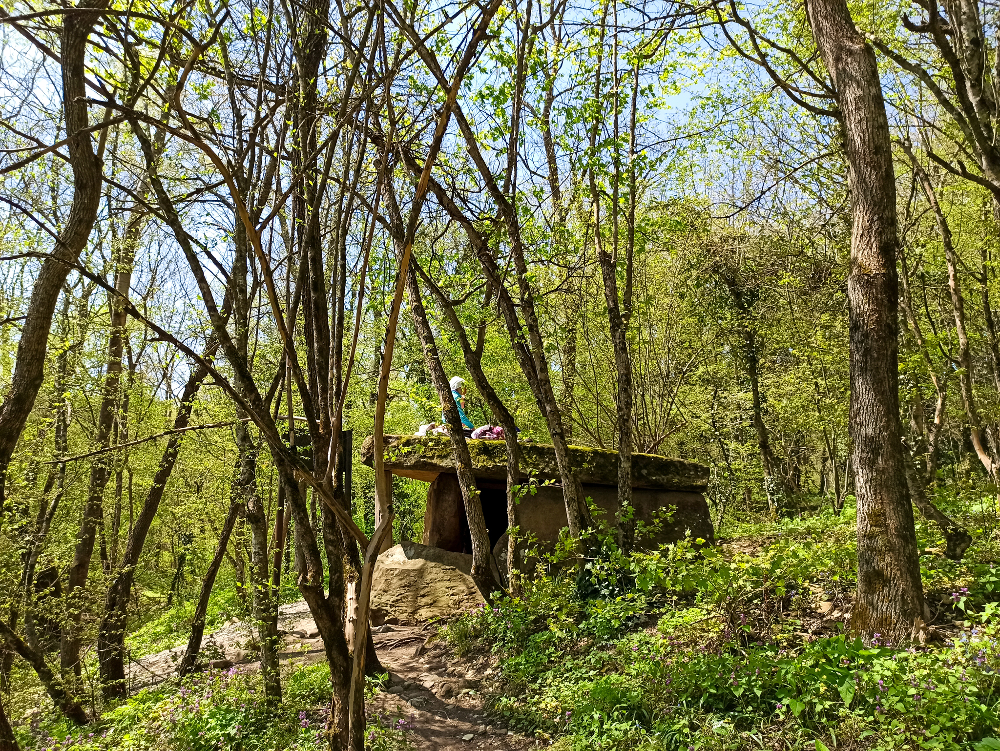Внизу находятся два дольмена, которые испытывают повышенное внимание от посетителей. По одному прыгал ребенок. Другой насиживали туристы: