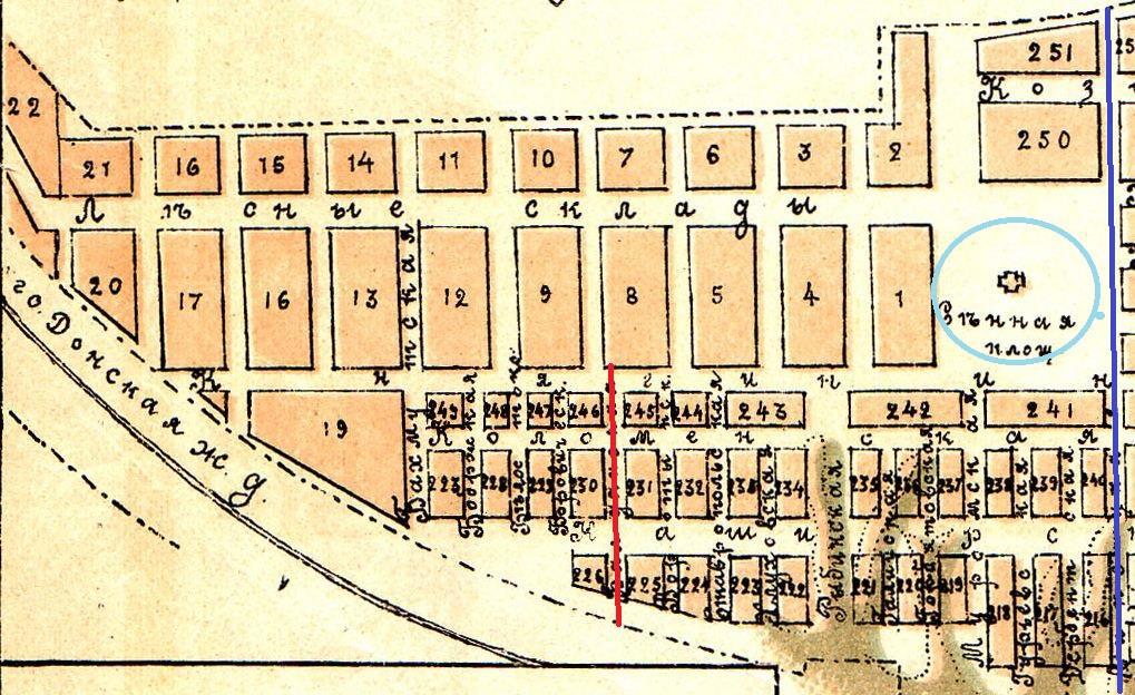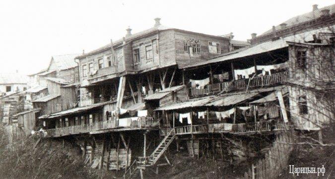 Для того, чтобы легче было ориентироваться, зная современный Волгоград, вспомним, что улица Липецкая (помечена синим) ныне называется Баррикадной, и по ней ходил тогда и ходит сейчас трамвай, уходящий в заполотновскую часть Города через "прокол" под железнодорожным полотном. На месте Сенной площади (обведена голубым) сейчас находится школа №130 и несколько жилых домов, а вот всё пространство выше Княгининской (ныне Рабоче-Крестьянской) левее Сенной, вплоть до самой реки Ельшанки, названо Лесными складами. Именно они там и находились - окраина купеческого Города и близость сразу двух железных дорог (Тихорецкой и Волго-Донской). А ещё там были прилегавшие к одноимённой площади Сенные ряды и кузницы. Ниже Княгининской располагался густонаселённый бедняцкий посёлок Кавказ. Или "Капказ", как его обычно называли те, кто в нём жили. Почему он получил такое название? Фото второй половины девятнадцатого века: