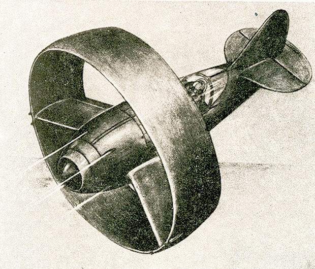 Может немцы вдохновили французов, а может сами придумали, но 1959 году они сделали реактивный вертикально взлетающий самолёт с кольцевым крылом SNECMA C-450 Coleoptere. Он взлетел, упал и на этом программу прикрыли. Остались только фотки: