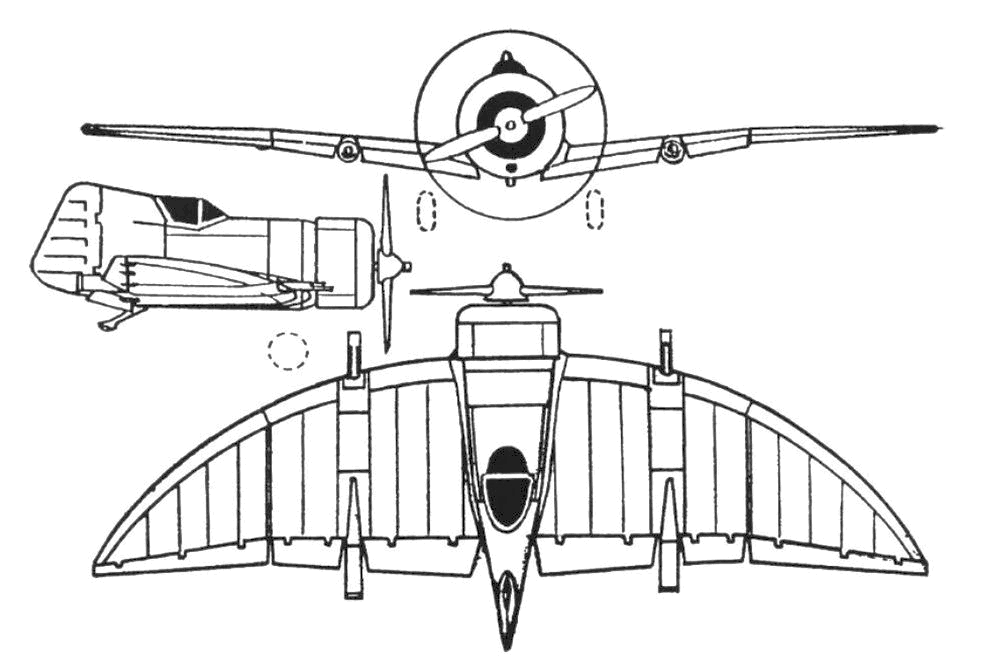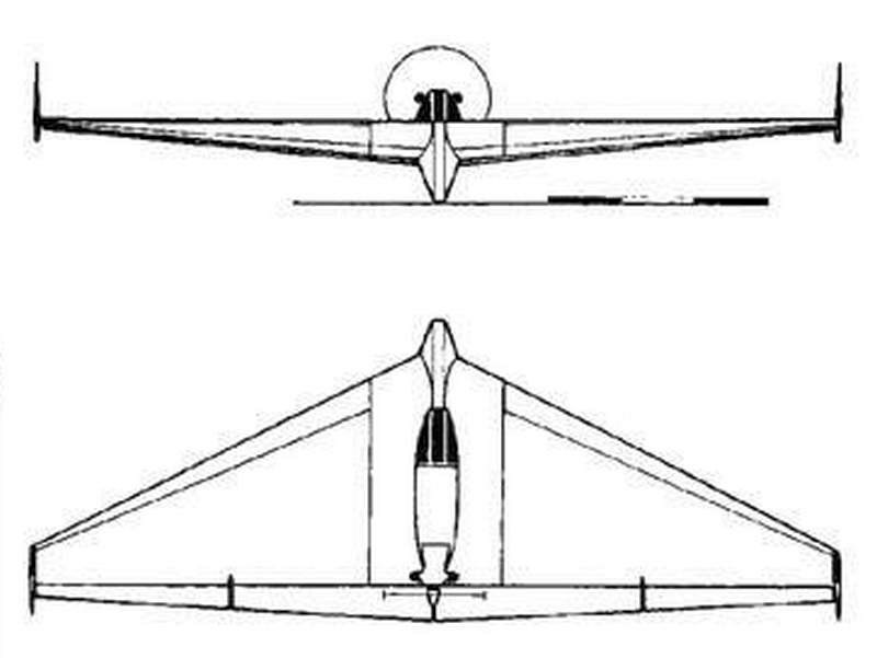 Скажу больше. Летающие крылья были не только стреловидными или трапецеидальными. Пробовали формы и менее технологичные, как вот на этом пушечном истребителе БИЧ-17: