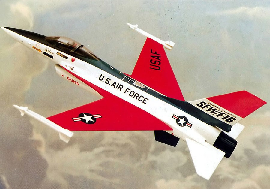 Американцы действительно эту тему долго, хотя и безуспешно прорабатывали. Говорят, что они не смогли решить проблему с прочностью. Ну, не знаю можно им верить или нет. Но хотели и пытались - это точно. Вот, например фотография их до сих пор стоящего на вооружении F-16, но в варианте с крылом обратной стреловидности: