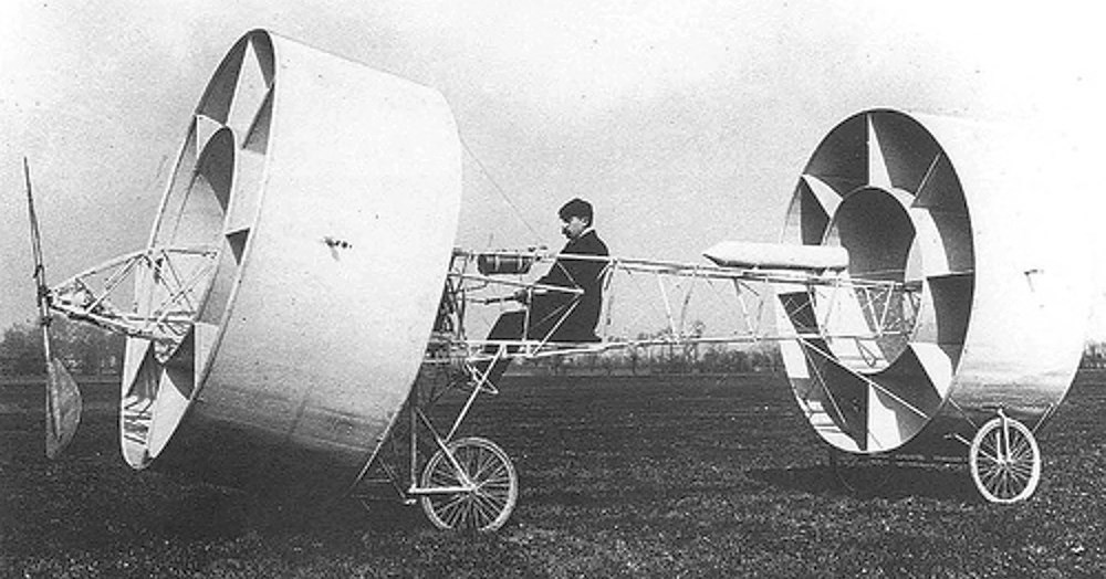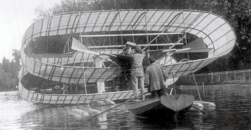 Вроде бы обычный биплан, однако его крылья замкнуты дугами. Эта летающая, а точнее так и не взлетевшая лодка замечательна тем, что перед нами так называемый «кольцеплан». Точнее один из первых кольцепланов (1906 г.). Идея замкнутого крыла занимала многие умы. Не буду описывать потенциальные преимущества такой схемы. Не это важно. Важен поиск и то, насколько он был сложным. Ведь кольцеплан Блерио был совсем не единственным. Были и другие.