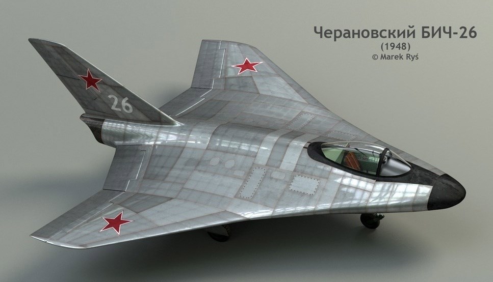 Вот все говорят "стелс"... В середине 70-х годов на военной кафедре в программу обучения у нас входил и этот курс тоже. Только у него не было столь поэтичного названия (его уже позже американцы дали), а называлось это всё комплексом мер по снижению радиолокационной заметности. Они делились на активные и пассивные. Вот как раз то, что американцы назвали словечком "стелс" и являлось пассивной защитой. Но начиналось всё это ещё раньше. Примерно тогда, когда заметили, что самолёты типа летающее крыло на радарах дают куда меньшую засветку, чем обычные. Ребята, представьте себе послевоенный СССР в 1949 году, когда самые первые шаги делала наша реактивная авиация. Именно тогда Черановским был спроектирован истребитель БИЧ-26. Посмотрите на него: