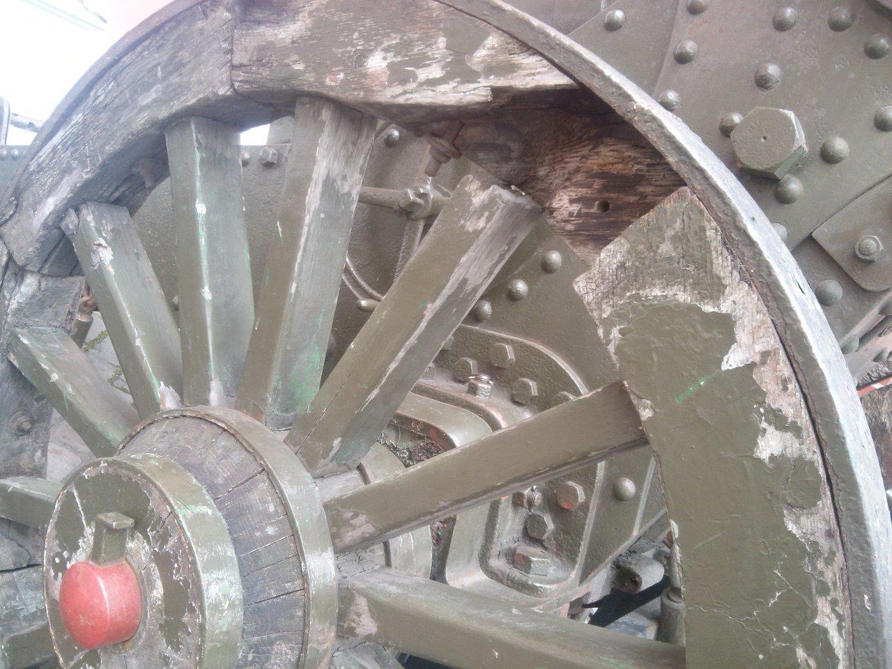 Хорошо разглядели деревянные части? Да оно всё из дерева! Ну тока разве что обод железный, а так даже ступица хоть обручами и схвачена но опять-таки деревянная. А весу на себе конкретно вот эти деревянные колёса несут 5.7 тонны (точнее сказать несли в былые лучшие времена - а нынче под станком сооружены стальные подставки, чтобы разгрузить порядком обветшавшие колёса).