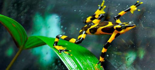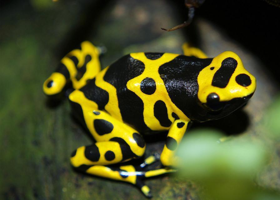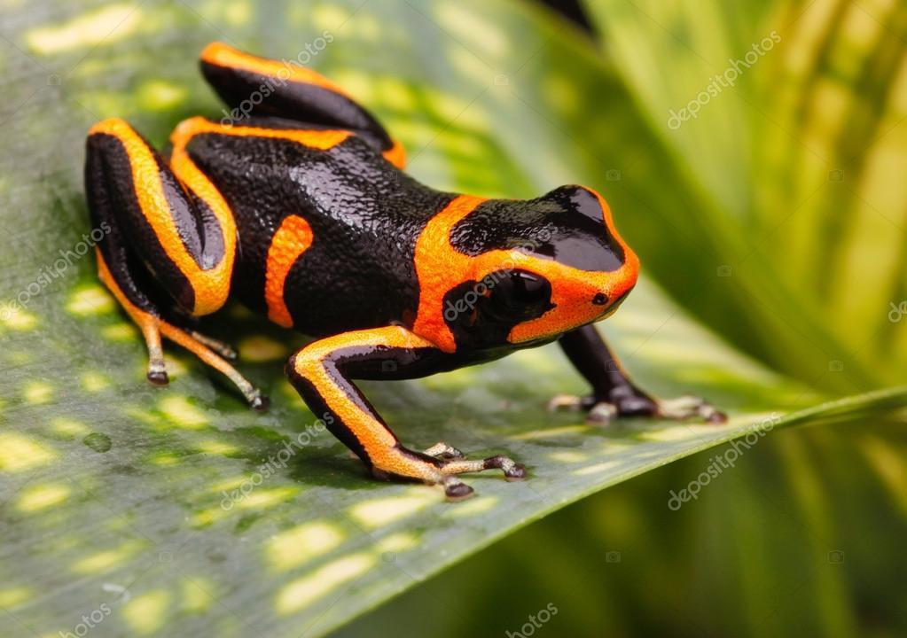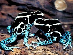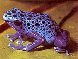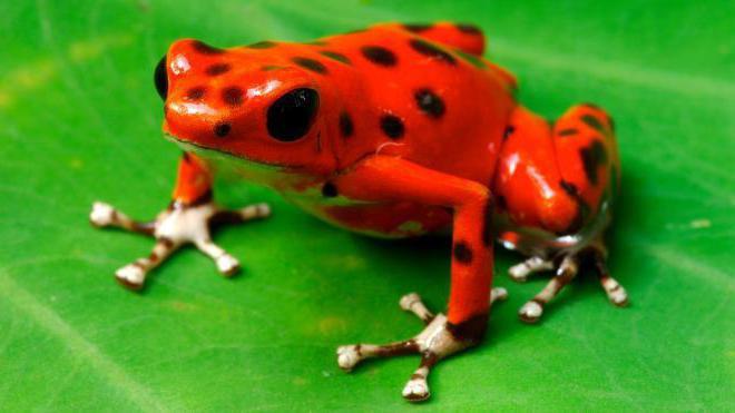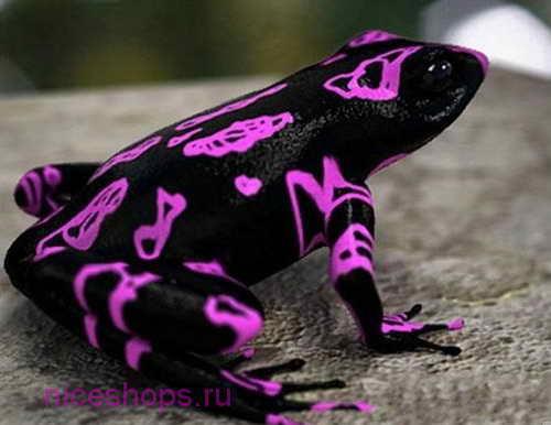 Лягушка арлекин. Окрас всегда очень яркий, хотя цветовая палитра может быть различной. Чаще всего на темном фоне располагается множество ярких пятен. Встречаются и другие варианты окрасов: оранжевый и зеленый, красный и желтый и даже фиолетовый.