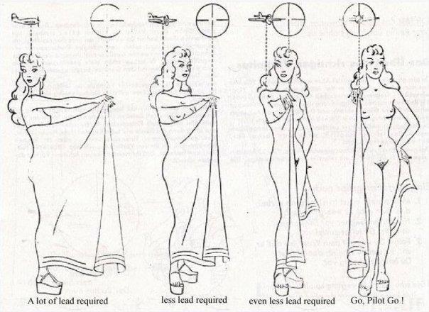 Ограниченные скорости того времени позволяли с достаточно высокой вероятностью сбивать самолеты противника со всех ракурсов - спереди, сзади, сбоку. Безусловно, лучшей позой лучшим ракурсом атаки было "сзади" - минимальная боковая скорость цели и много времени на обстрел. А в случае с одноместным истребителем еще и не будет ответного огня. "Спереди" уже считалась сильно хуже - мало времени на прицеливание и огонь, но этого ракурса было проще добиться. Сбоку времени на прицеливание было чуть больше, но нужно было брать упреждение. Короче, см. рисунок. Я так и не понял американское это руководство или немецкое с переводом.