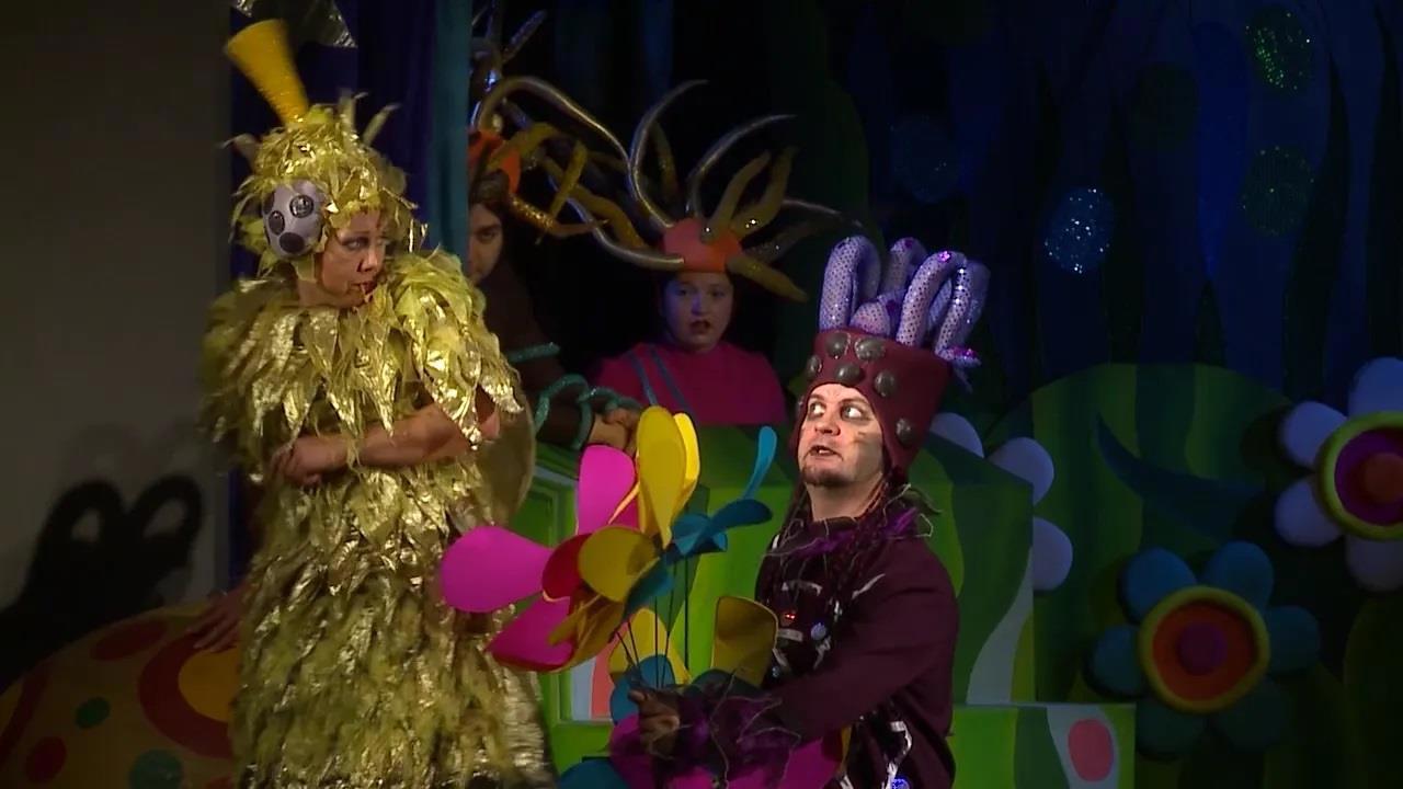 Декорации меняются и перед нами полянка, на которой идет вечеринка Мухи. По оригинальному тексту подводится результат ее шопинга, а друзья начинают дарить подарки.