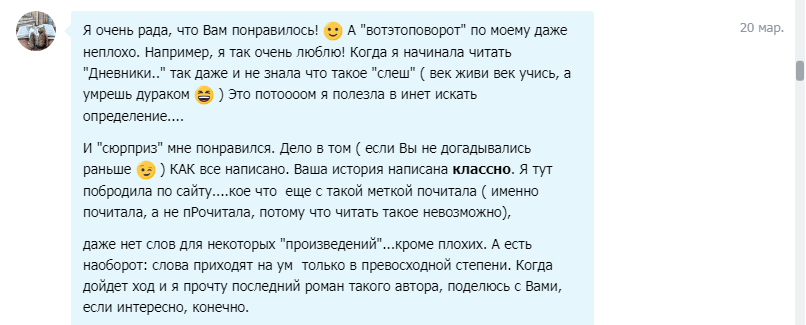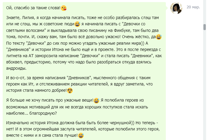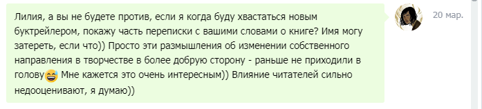 Автор: Бассандра КаллиганОбсуждали мы с одним хорошим человеком только что сделанный буктрейлер к "Дневникам Ит", тот самый, что висит в допах под книгой. И вот, внезапно, разговор съехал на "высокие материи" - в частности, я вдруг осознала как на меня влияют мои читатели.