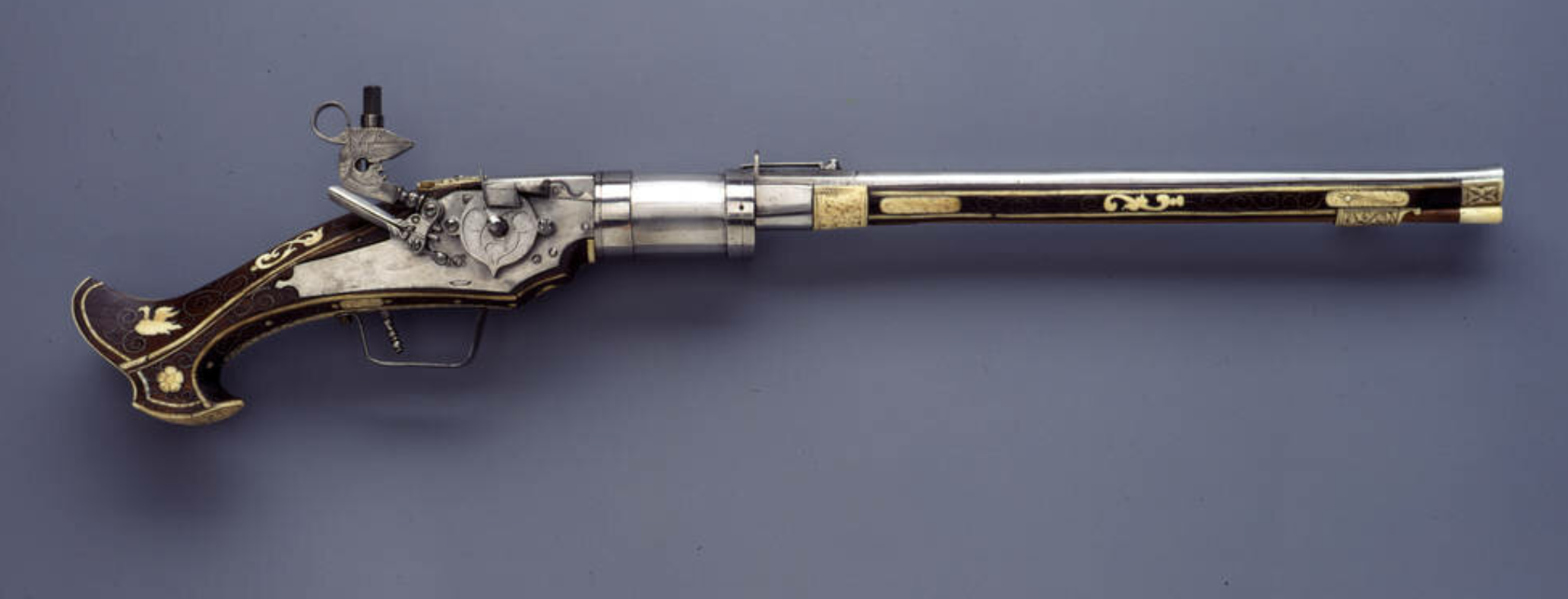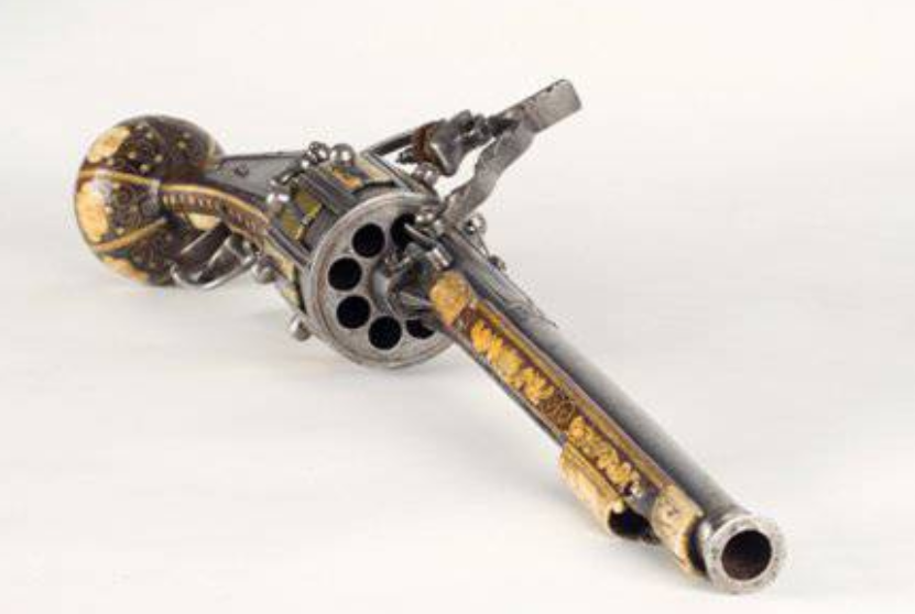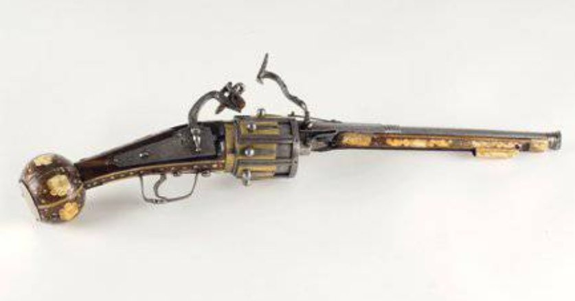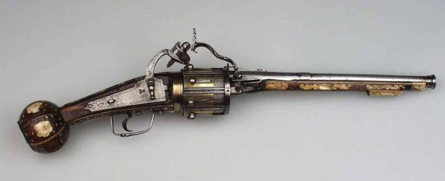 Впрочем, в Оружейной палате Дрездена есть и револьвер, более похожий на знаменитое оружие XIX века — он имеет барабан, рассчитанный на 6 зарядов, но все тот же колесцовый замок и необходимость поворота барабана вручную. Сделан он был тоже в Нюрнберге, но в 1610 году.