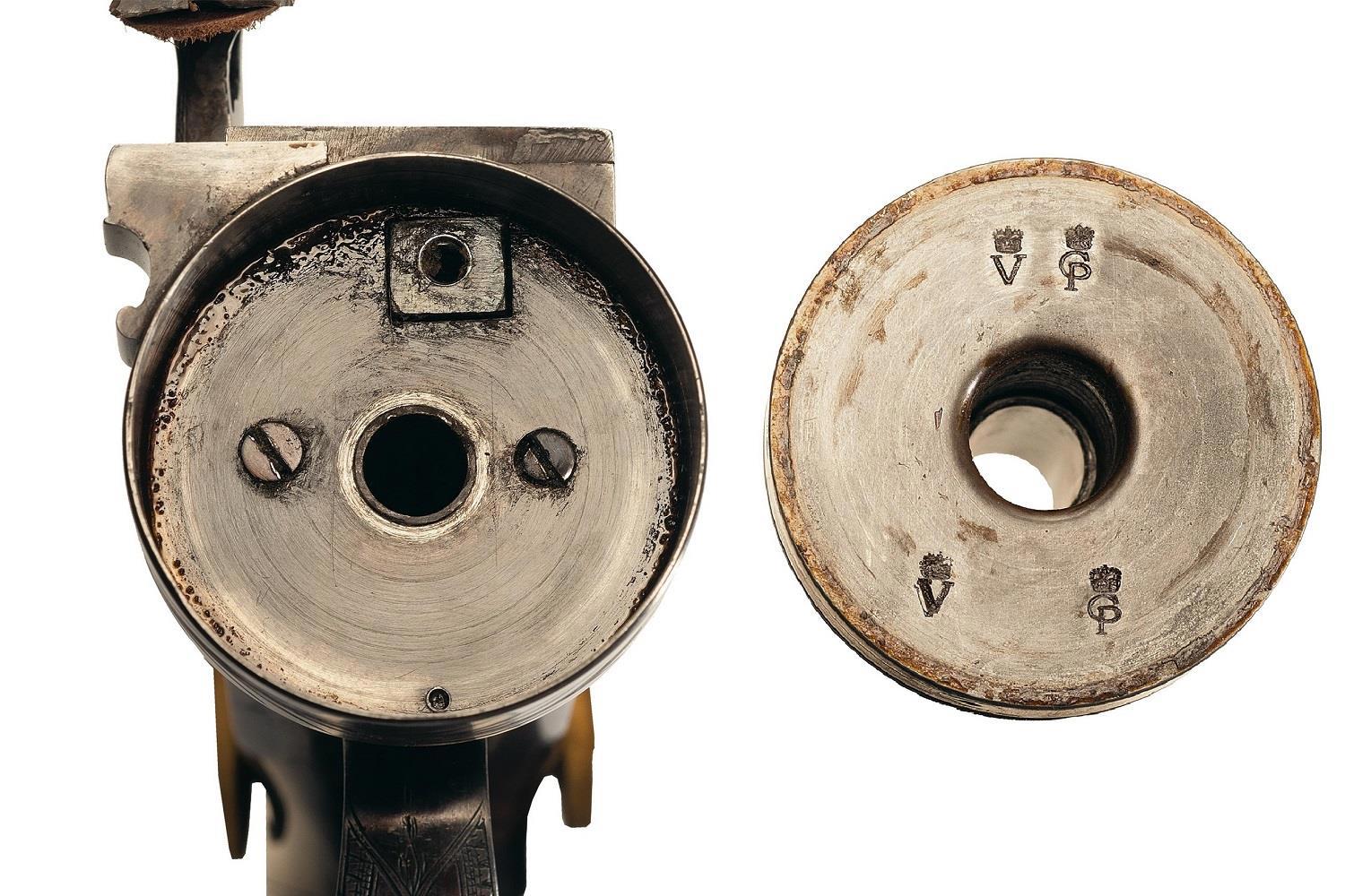 Свой револьвер с колесцовым замком имеет и Оружейная палата Британии. Впрочем, это не пистолет, а карабин, но зато с барабаном, рассчитанным тоже на 6 зарядов. Сделан он был также в Германии, в 1610 году. Любопытно, что ствол этого карабина сделан в форме ствола пушек тех лет.