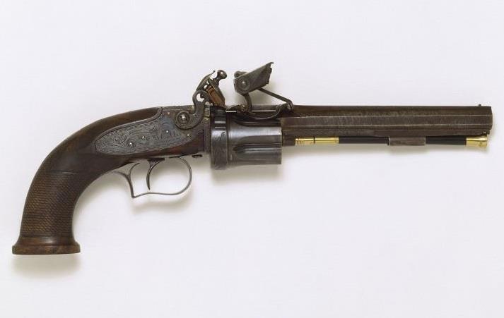 На сегодняшний день считается, что первое короткоствольное оружие, имеющее барабан и кремневый механизм воспламенения был изготовлен в 1597 году.