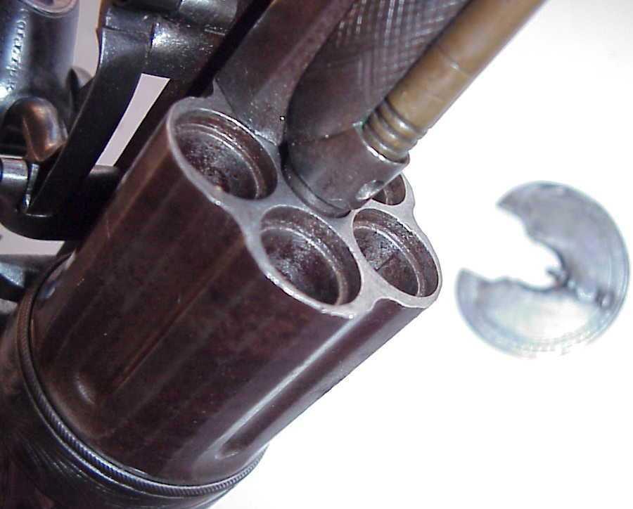 Впрочем, оружие впечатляет не только автоматически вращающимся барабаном, но и калибром — 12,7 мм. И весила эта «пушка» соответственно: при общей длине оружия 55,1 см и длине ствола 24,1 см оно «потянуло» на 2830 г. Любопытно, что большинство металлических деталей оружия, включая ствол, сделаны из латуни.