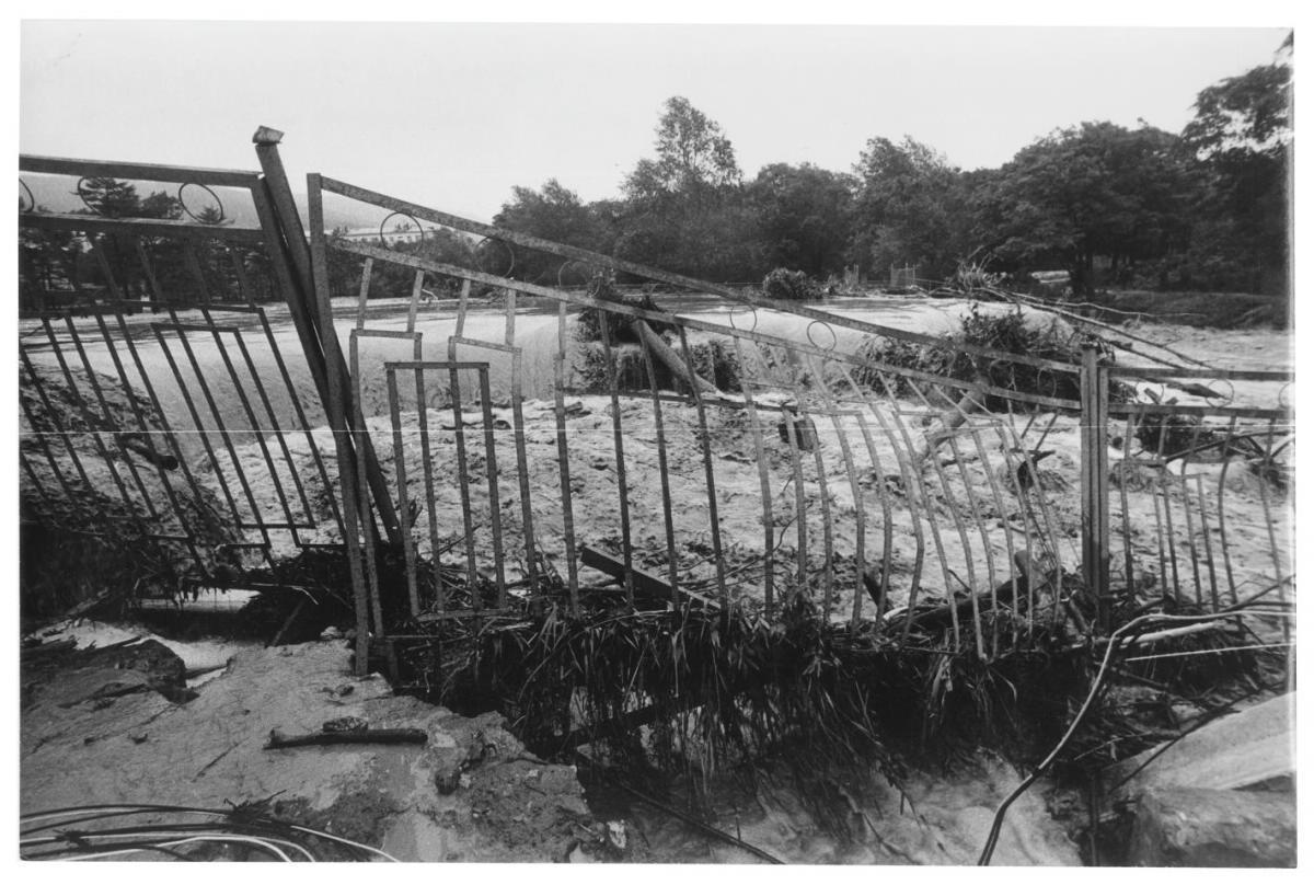 Воду с него, когда надо, потихоньку спускают. В обычное время течёт неглубокая речушка. Но тогда, в 1981 году, задвижку на плотине Верхнего пруда (того, что в самом парке находится) также переполненого водой, открыть не смогли. На водохранилище тоже. Механизмы были в нерабочем состоянии... И вода стала перехлестывать через стенку, ту, что видна на предыдущем фото.