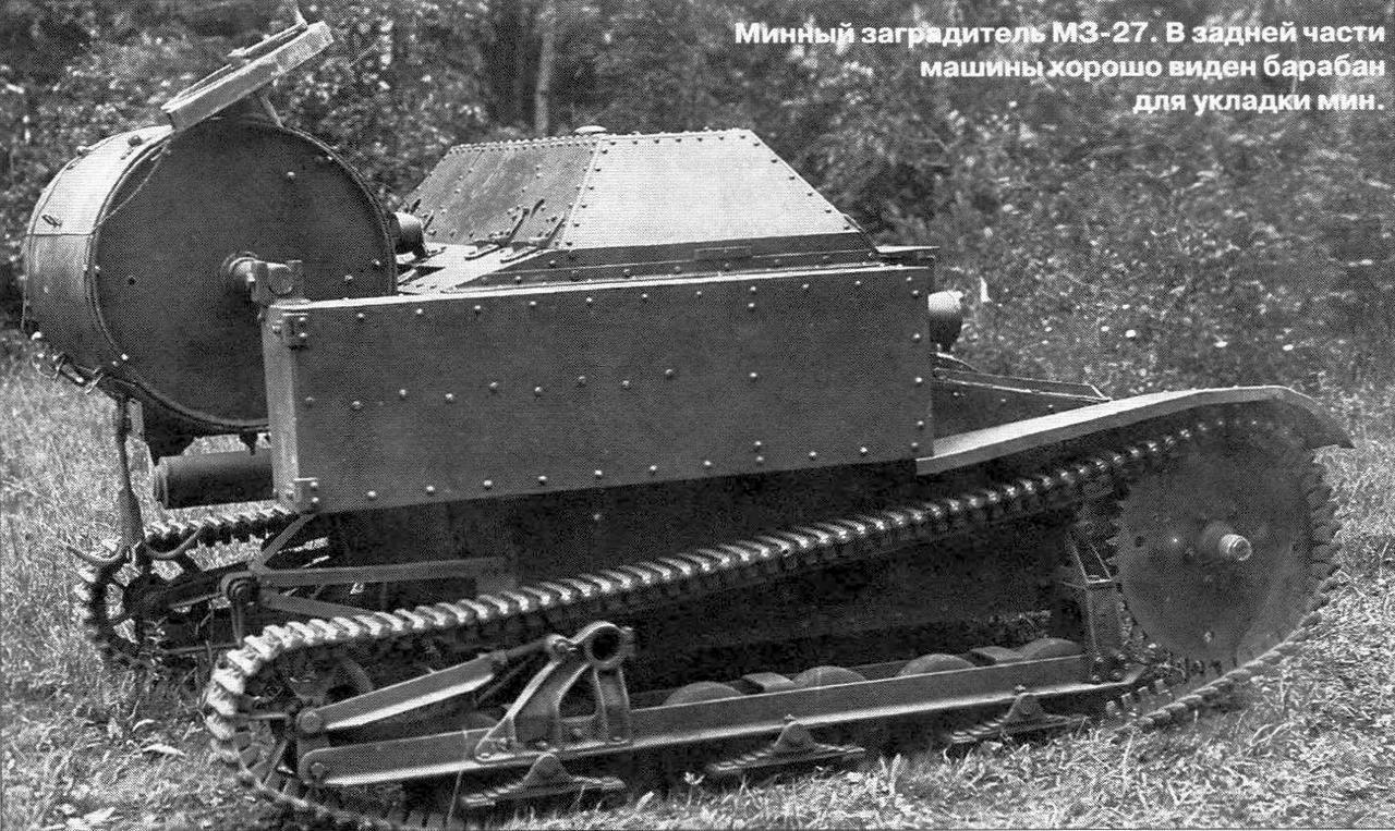 Сами артиллеристы разместились хоть и не на штатных местах (они выше и по бокам), но достаточно удобно. Разумеется, наши тоже экспериментировали с установкой разного оружия и с вариантами применения танкетки. Среди вариантов была и машина снабжения переднего края, и мостоукладчик. Вот на этой фотографии опытная машина на базе Т-27 по минированию: