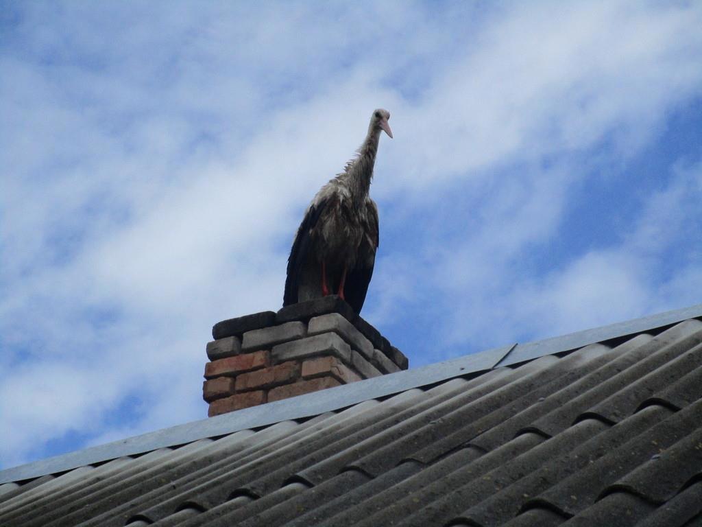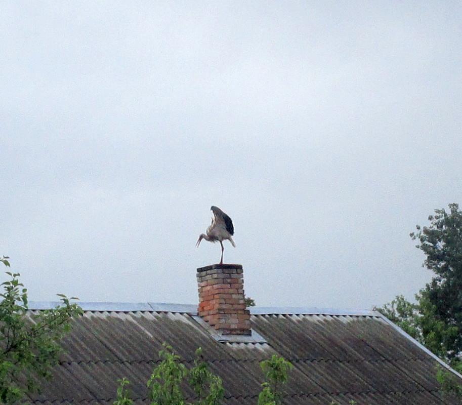 Этот громадный аист перелетел дорогу прямо передо мной и сел на трубу соседского дома. Какой-то он странный, аист этот. Смахивает на грифа.