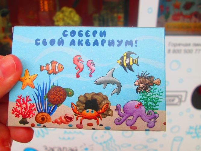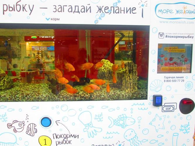 После перекуса мы наткнулись еще и на такую игру. В большом аквариуме плавает стайка голодных рыбешек. Накормить их стоит 100 рублей. В подарок из аппарата выскакивает небольшой приз.