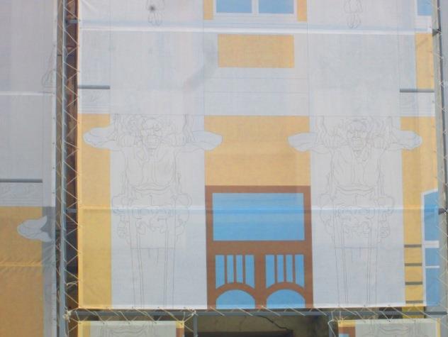 В принципе, фотографии фасада у меня где-то имеются: как-то давным-давно я наткнулась на этих страшилищ и воскликнула: «Надо ж, какие гарпии! Стоит запечатлеть на память» Но искать их сейчас недосуг. А с попыткой сфоткать их еще раз теперь мне совершенно не повезло. Наконец, дом Яхимовича закрыли на реставрацию, и это ведь очень здорово! Говорят, в последние годы у дома стала отваливаться лепнина, а представляете, если какой-нибудь фрагмент шарахнется кому-нибудь на голову?! Потому, все, что нам удалось увидеть — закрытый полотном страшно-прекрасный фасад...