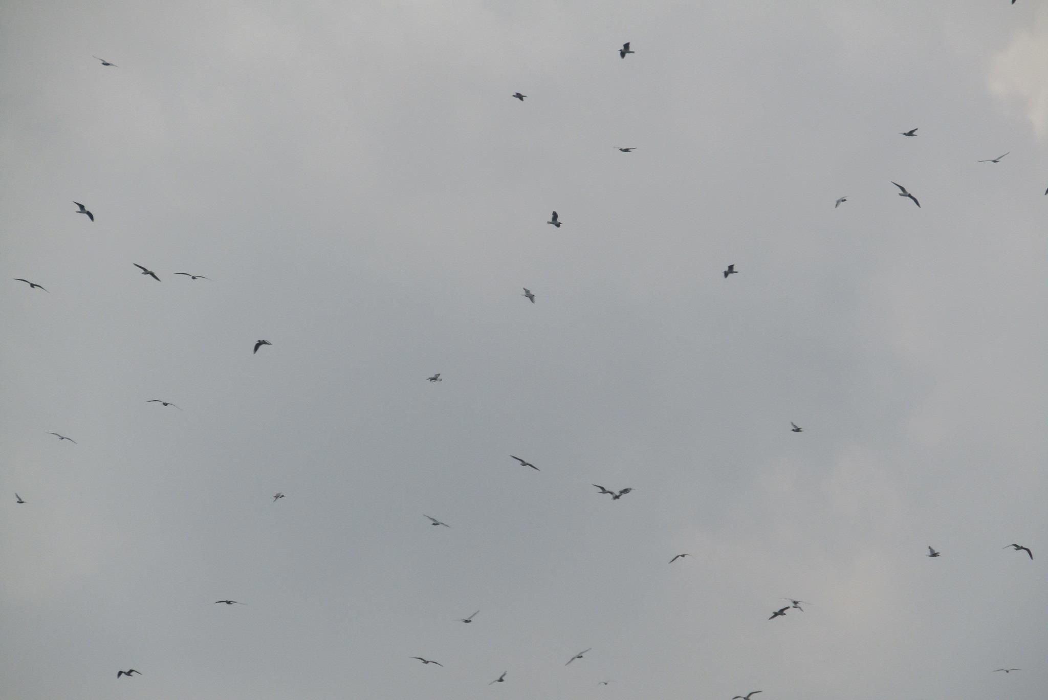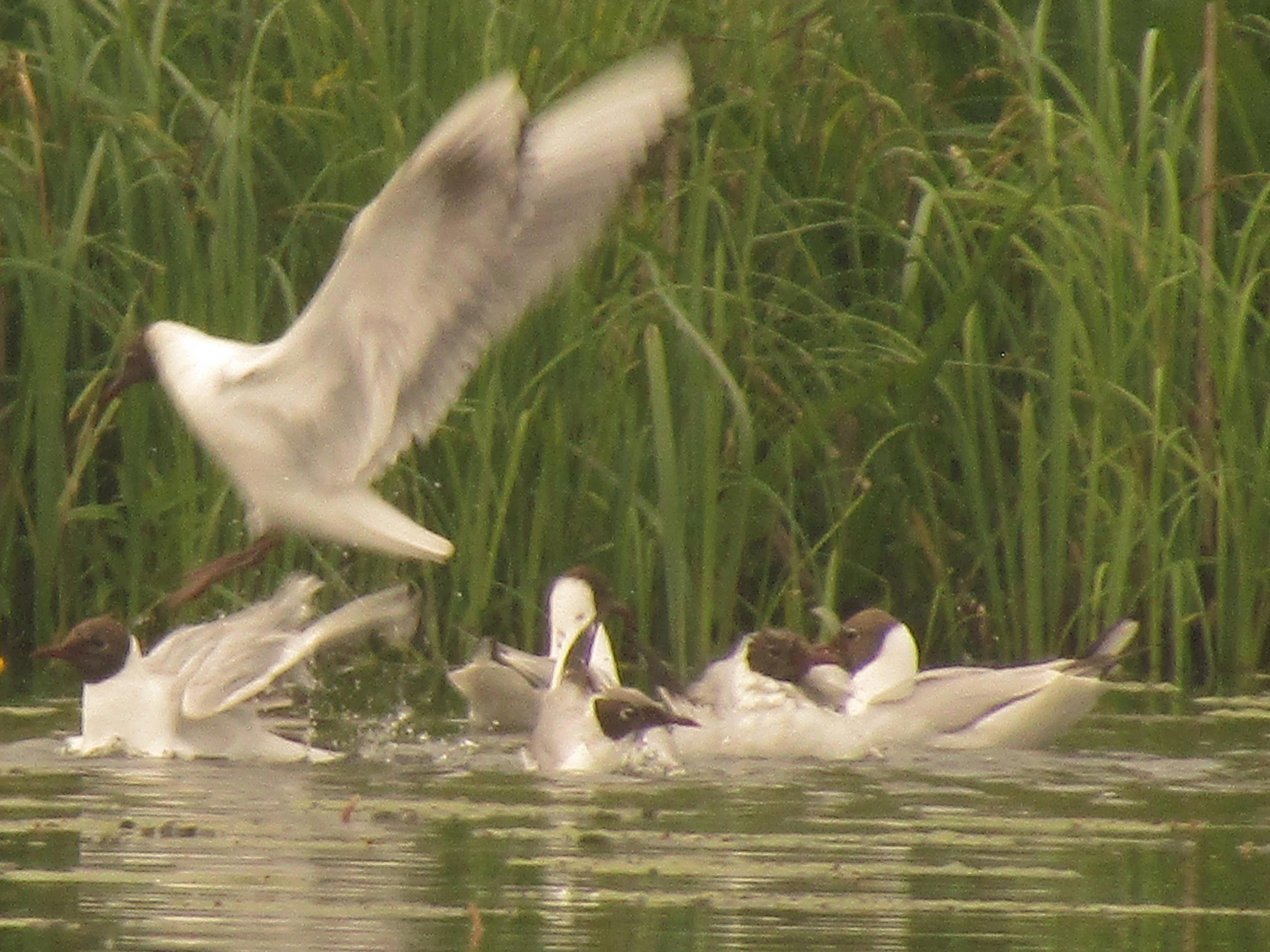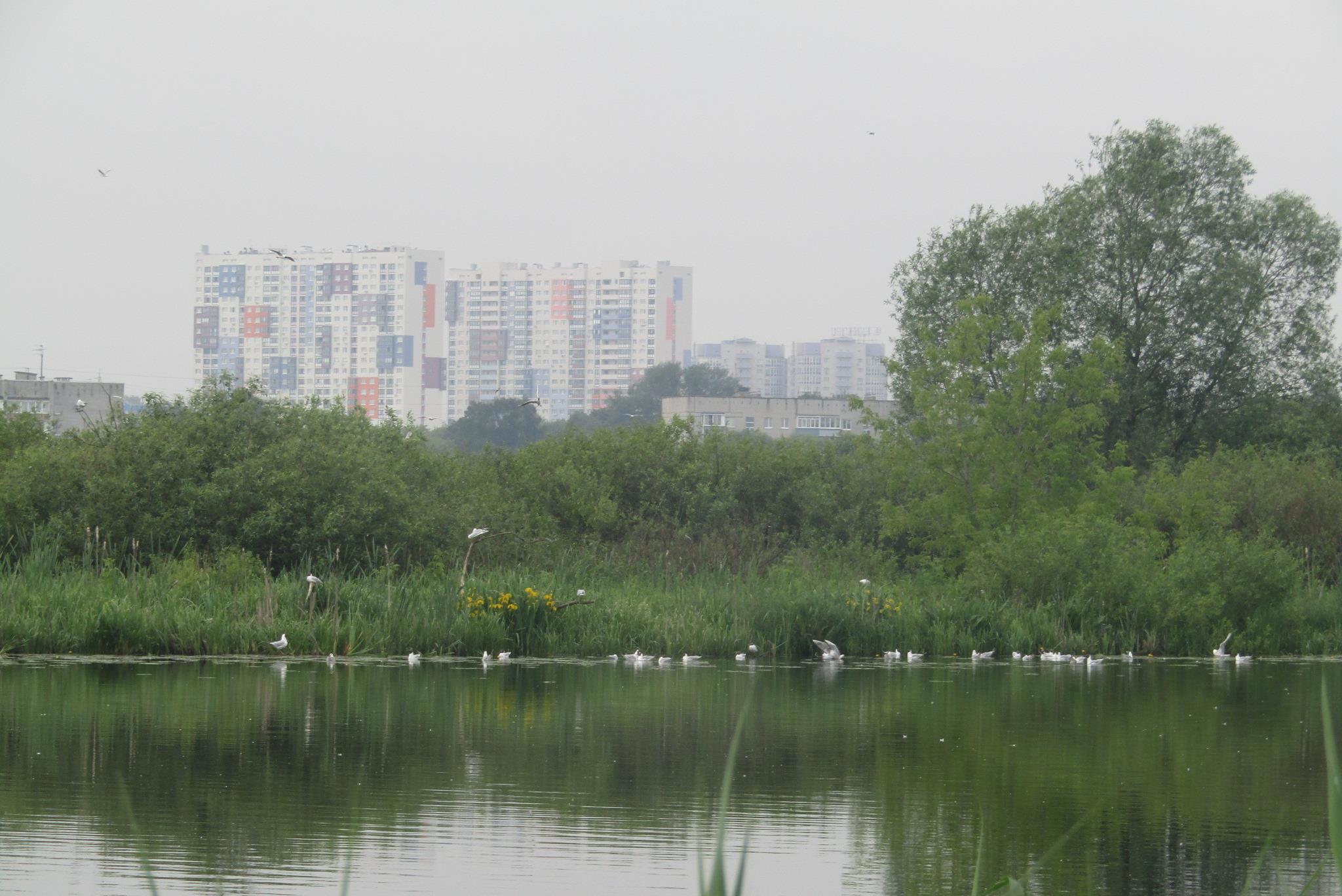 Еще продираясь сквозь заросли, услышала чаек. А потом их увидела. Над озером их было... тучи. Воздух буквально нашпигован. Некоторым не хватило места в воздухе, они сидели на воде (моя дочь, увидев фото сидящих там чаек, удивилась: "Мам, а они и плавать умеют?") Но вот подобраться к берегу не удалось. Кругом были сплошь кусты. Шлепая по грязи под ними (тропинка пополам с лужами) нашла лишь несколько удобных спусков. Но один был занят рыбаком, возле второго явно была устроена присада (кто-то до меня оборудовал наблюдательный пункт), посему постояла возле третьего клочка открытой воды и... ушла. Тем более, что дождь шел. Погода не шептала. Там где-то и подошву оставила...