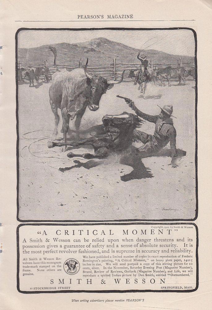 Автор: Андрей УлановДавным-давно, когда еще не придумали компьютерную графику, чтобы заманивать покупателя в оружейку чудным зрелищем вылетающего при выстреле из ствола совершенного целого патрона, уважающие себя оружейные фирмы заказывали у известных художников картины для рекламы своей продукции. В частности, в начале 20-ого века фирма "Смит-Вессон" заказала несколько картин у Фредерика Ремингтона – к слову, родственника Элифалета Ремингтона, основателя компании Remington Arms Company.